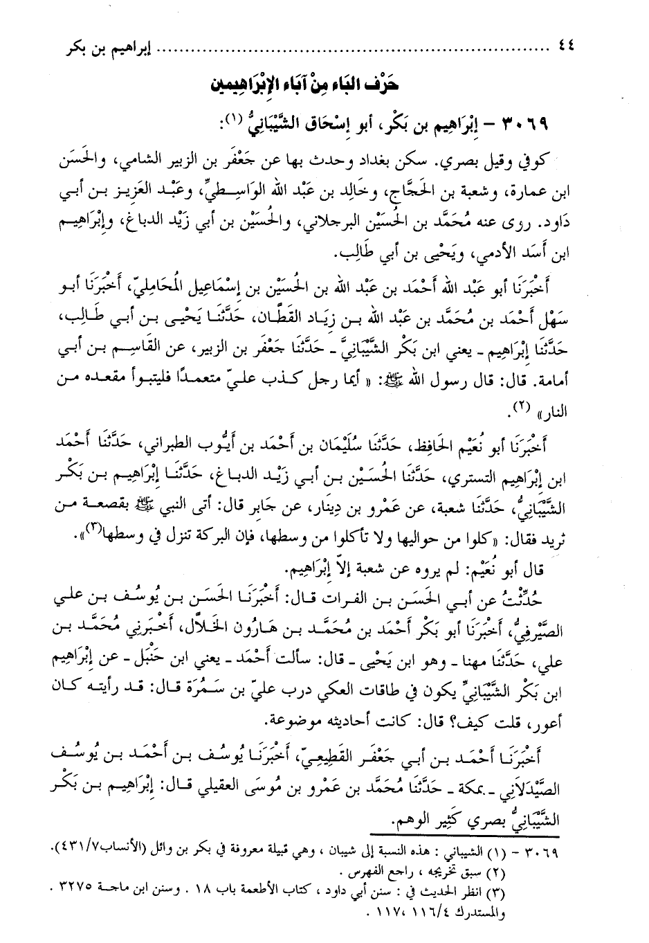 [1] 3069- الشيباني: هذه النسبة إلى شيبان، وهي قبيلة معروفة في بكر بن وائل (الأنساب 7/431) .