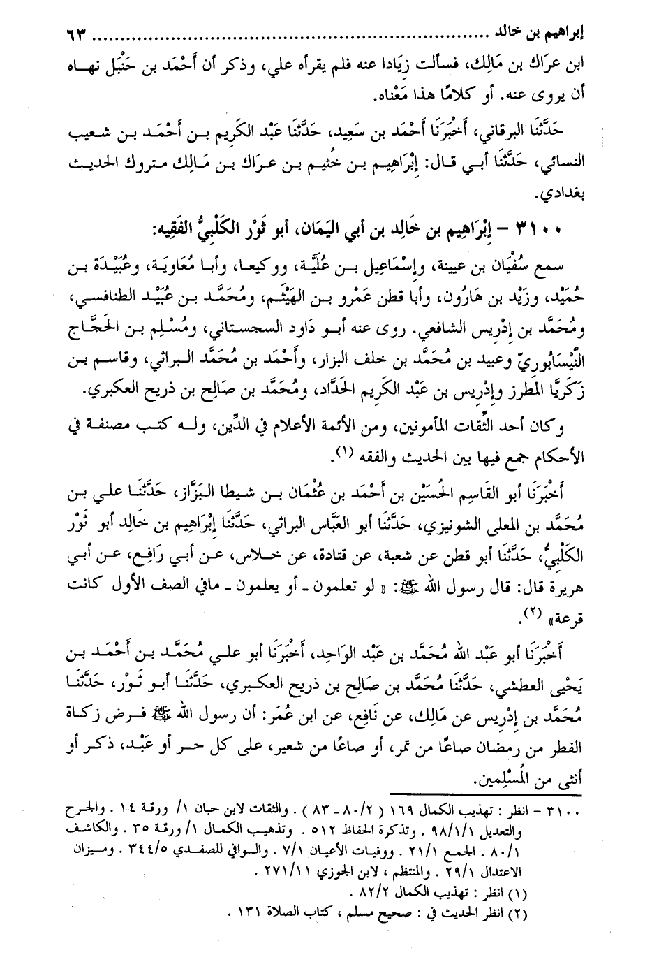 3100- إِبْرَاهِيم بْن خالد بْن أَبِي اليمان، أَبُو ثور الكلبي الفقيه [1] :