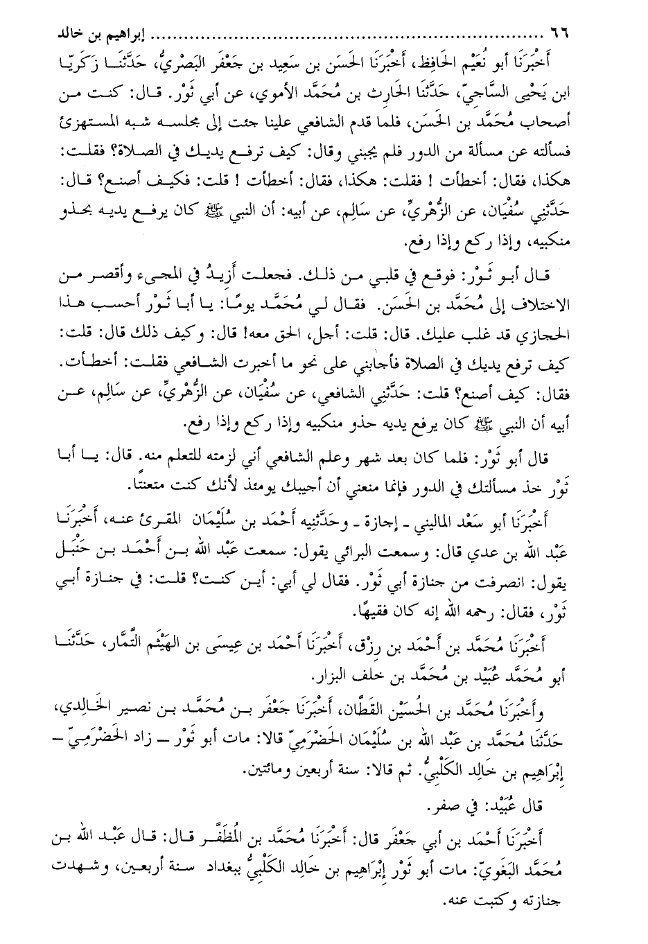 أخبرنا أبو نعيم الحافظ، أَخْبَرَنَا الْحَسَنُ بْنُ سَعِيدِ بْنِ جَعْفَرٍ الْبَصْرِيُّ، حدّثنا زكريّا ابن يحيى السّاجيّ، حَدَّثَنَا الْحَارِثُ بْنُ مُحَمَّدٍ الأُمَوِيُّ، عَنْ أَبِي ثَوْرٍ. قَالَ: كُنْتُ مِنْ أَصْحَابِ مُحَمَّدِ بْنِ الْحَسَنِ، فَلَمَّا قَدِمَ الشَّافِعِيُّ عَلَيْنَا جِئْتُ إِلَى مَجْلِسِهِ شِبْهَ الْمُسْتَهْزِئِ فَسَأَلْتُهُ عَنْ مَسْأَلَةٍ مِنَ الدُّورِ فَلَمْ يُجِبْنِي وَقَالَ: كَيْفَ تَرْفَعُ يَدَيْكَ فِي الصَّلاةِ؟ فَقُلْتُ: