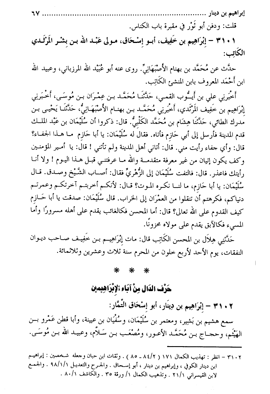 [1] 3102- انظر: تهذيب الكمال 171 (2/84- 85) . وثقات ابن حبان وجعله شخصين: إبراهيم ابن دينار الكوفي، وإبراهيم بن دينار، أبو إسحاق. والجرح والتعديل 1/1/98. والجمع لابن القيسراني 1/21. وتذهيب الكمال 1/ورقة 35. والكاشف 1/80.