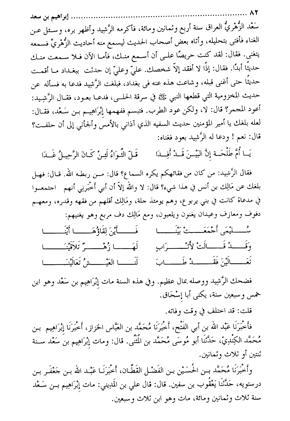 سعد الزهري العراق سنة أربع وثمانين ومائة، فأكرمه الرشيد وأظهر بره، وسئل عَنِ الغناء فافتي بتحليله، وأتاه بعض أصحاب الحَدِيث ليسمع منه أحاديث الزهري فسمعه يتغنى. فَقَالَ: لقد كنت حريصا عَلَى أن أسمع منك، فأما الآن فلا سمعت منك حَدِيثا أبدا. فَقَالَ: إذا لا أفقد إلا شخصك. عَلَيَّ وعَلَيَّ إن حدثت ببغداد ما أقمت حَدِيثا حتى أغنى قبله، وشاعت هذه عنه في بغداد، فبلغت الرشيد فدعا بِهِ فسأله عَن حَدِيث المخزومية التي قطعها النَّبِيّ صَلَّى اللَّهُ عَلَيْهِ وَسَلَّمَ فِي سرقة الحلى، فدعا بعود، فَقَالَ الرشيد: