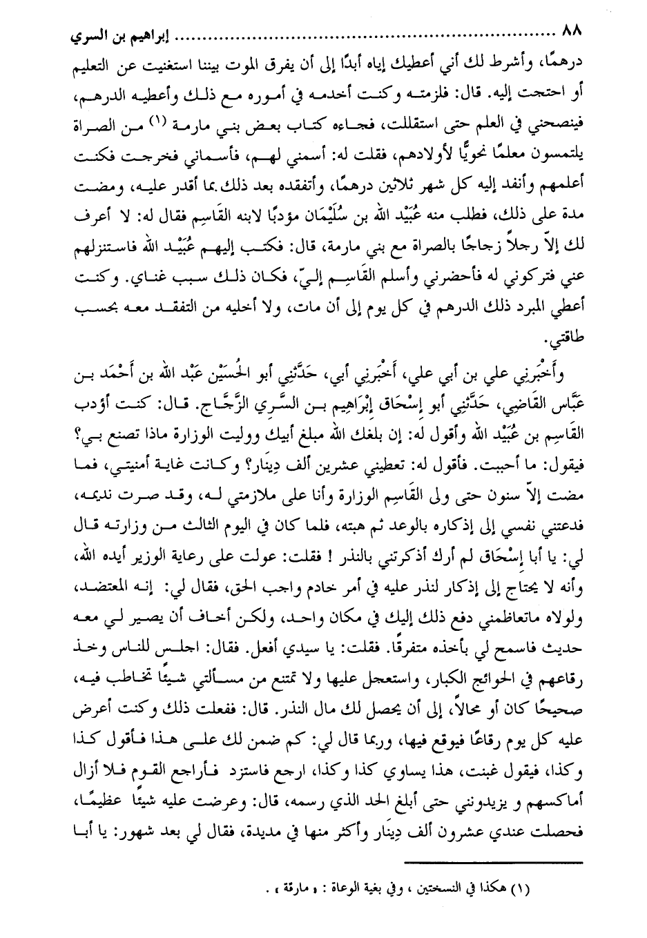 درهما، وأشرط لَكَ أني أعطيك إياه أبدا إِلَى أن يفرق الموت بيننا استغنيت عَنِ التعليم أو احتجت إليه. قَالَ: فلزمته وكنت أخدمه فِي أموره مع ذلك وأعطيه الدرهم، فِينصحني فِي العلم حتى استقللت، فجاءه كتاب بعض بني مارمة [1] من الصراة يلتمسون معلما نحويا لأولادهم، فقلت له: أسمني لهم، فأسماني فخرجت فكنت أعلمهم وأنفد إليه كل شهر ثلاثين درهما، وأتفقده بعد ذلك بما أقدر عَلَيْهِ، ومضت مدة عَلَى ذلك، فطلب منه عبيد اللَّه بْن سُلَيْمَان مؤدبا لابنه الْقَاسِم فَقَالَ له: لا أعرف لَكَ إلا رجلا زَجَّاجًا بالصَّرَاةِ مع بني مارمة، قَالَ: فكتب إليهم عبيد اللَّه فاستنزلهم عني فتركوني له فأحضرني وأسلم الْقَاسِم إليَّ، فكَانَ ذلك سبب غناي. وكنت أعطي المبرد ذلك الدرهم فِي كل يوم إِلَى أن مات، ولا أخليه من التفقد معه بحسب طاقتي.