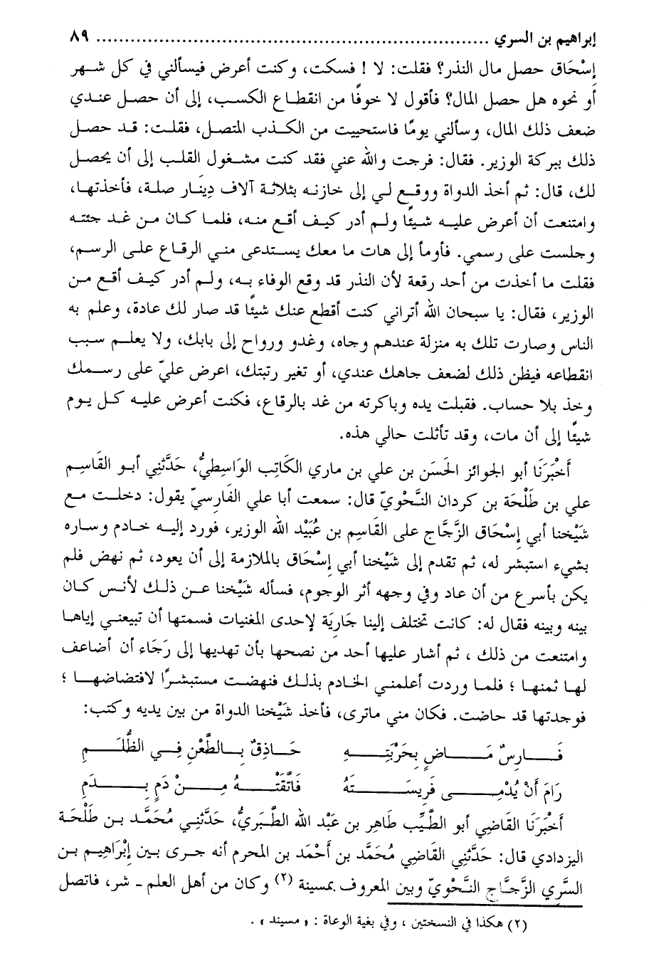 أَخْبَرَنَا الْقَاضِي أَبُو الطَّيِّبِ طَاهِرُ بْن عَبْدِ اللَّهِ الطّبريّ، حَدَّثَنِي مُحَمَّد بْن طلحة اليزدادي قَالَ: حَدَّثَنِي الْقَاضِي مُحَمَّد بْن أَحْمَد بْن المحرم أنه جرى بين إبراهيم بن السري الزجاج النحوي وبين المعروف بمسينة [1] وكَانَ من أهل العلم- شر، فاتصل