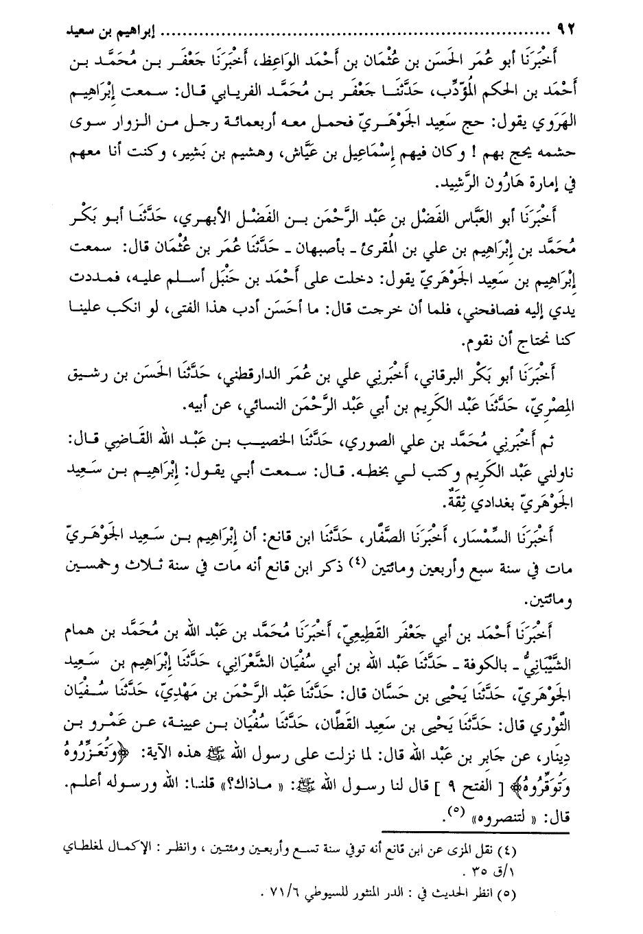 أَخْبَرَنَا السمسار، أخبرنا الصّفّار، حَدَّثَنَا ابْن قانع: أن إِبْرَاهِيم بْن سَعِيد الجوهري مات فِي سنة سبع وأربعين ومائتين [1] ذكر ابْن قانع أنه مات فِي سنة ثلاث وخمسين ومائتين.