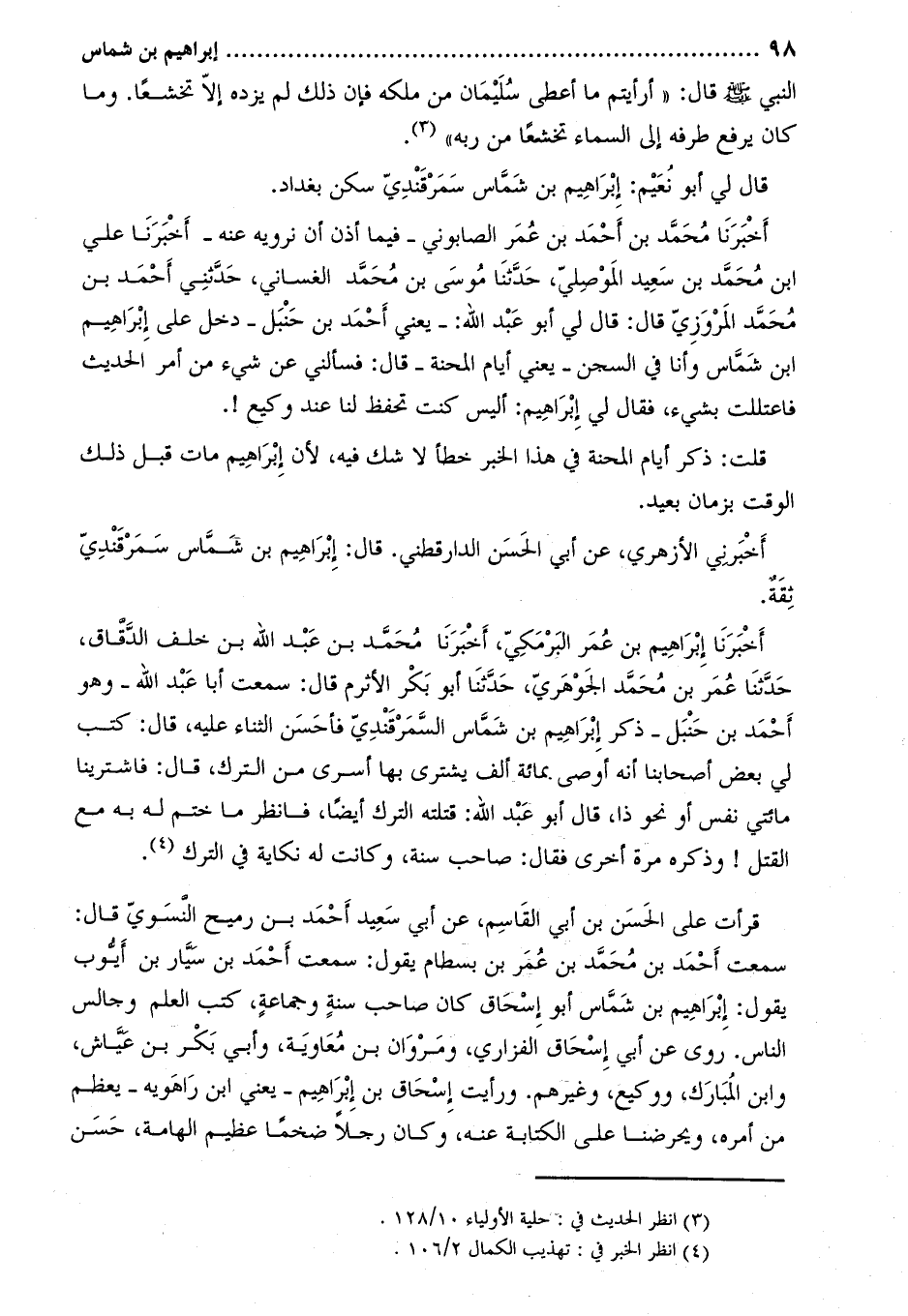 أَخْبَرَنَا إبراهيم بن عمر البرمكيّ، أخبرنا مُحَمَّدُ بْنُ عَبْدِ اللَّهِ بْنِ خَلَفِ الدّقّاق، حدّثنا عمر بن محمّد الجوهريّ، حدثنا أَبُو بكر الأثرم قَالَ: سَمِعْت أَبَا عَبْد الله- وهو أحمد بن حنبل- ذكر إبراهيم بن شماس السمرقندي فأحسن الثناء عليه، قال: كتب لي بعض أصحابنا أنه أوصى بمائة ألف يشترى بها أسرى من الترك، قَالَ: فاشترينا مائتي نفس أو نحو ذا، قَالَ أبو عبد الله: قتلته الترك أيضا، فانظر ما ختم له به مع القتل! وذكره مرة أخرى فقال: صاحب سنة، وكانت له نكاية في الترك [2] .
