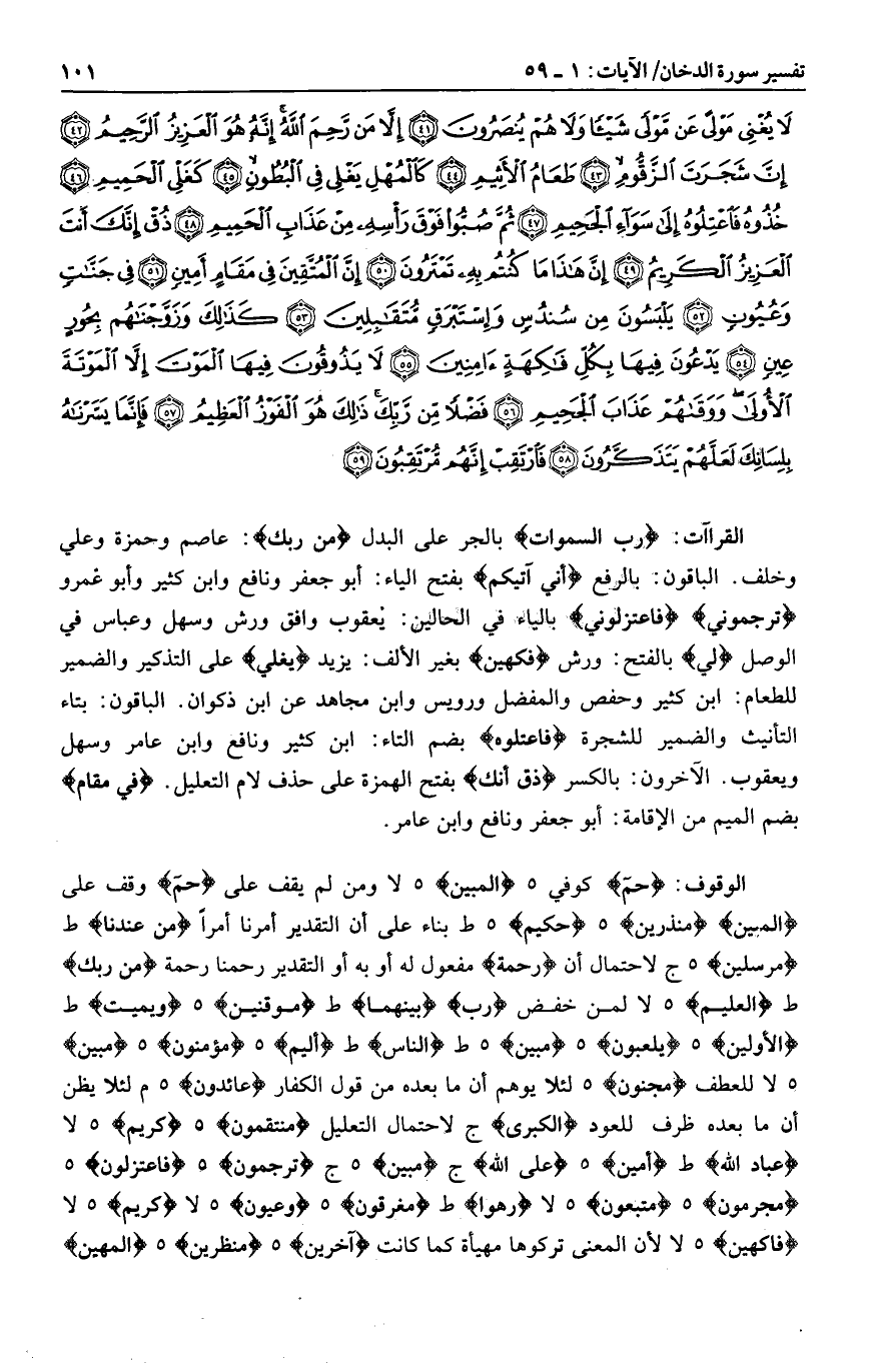 حم كوفي هـ الْمُبِينِ هـ لا ومن لم يقف على حم وقف على الْمُبِينِ مُنْذِرِينَ هـ حَكِيمٍ هـ ط بناء على أن التقدير أمرنا أمرا مِنْ عِنْدِنا ط مُرْسِلِينَ هـ ج لاحتمال أن رَحْمَةً مفعول له أو به أو التقدير رحمنا رحمة مِنْ رَبِّكَ ط الْعَلِيمُ هـ لا لمن خفض رَبِّ بَيْنَهُما ط مُوقِنِينَ هـ وَيُمِيتُ ط الْأَوَّلِينَ هـ يَلْعَبُونَ هـ مُبِينٍ هـ ط النَّاسَ ط أَلِيمٌ هـ مُؤْمِنُونَ هـ مُبِينٌ هـ لا للعطف مَجْنُونٌ هـ لئلا يوهم أن ما بعده من قول الكفار عائِدُونَ هـ م لئلا يظن أن ما بعده ظرف للعود الْكُبْرى ج لاحتمال التعليل مُنْتَقِمُونَ هـ كَرِيمٌ هـ لا عِبادَ اللَّهِ ط أَمِينٌ هـ عَلَى اللَّهِ ج مُبِينٍ هـ ج تَرْجُمُونِ هـ فَاعْتَزِلُونِ هـ مُجْرِمُونَ هـ مُتَّبَعُونَ هـ لا رَهْواً ط مُغْرَقُونَ هـ وَعُيُونٍ هـ لا كَرِيمٍ هـ لا فاكِهِينَ هـ لا لأن المعنى تركوها مهيأة كما كانت آخَرِينَ هـ مُنْظَرِينَ هـ الْمُهِينِ