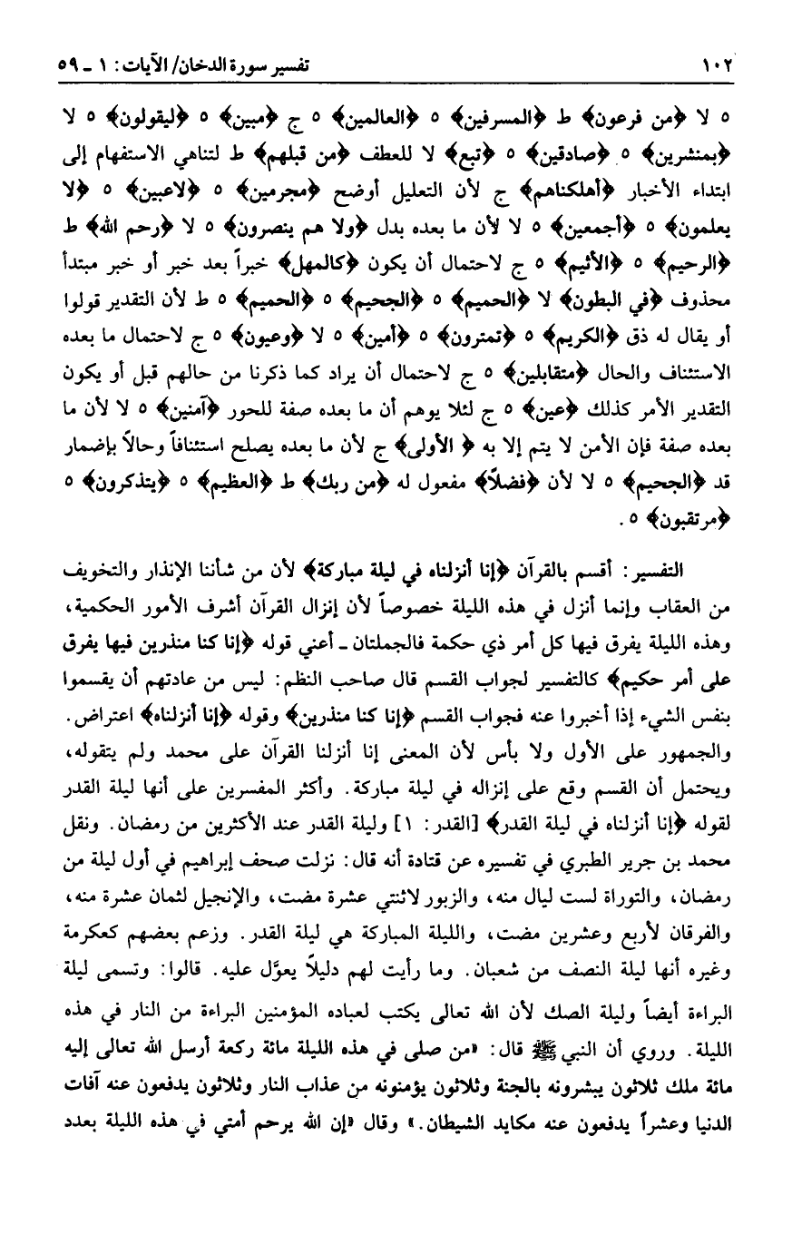 هـ لا مِنْ فِرْعَوْنَ ط الْمُسْرِفِينَ هـ الْعالَمِينَ هـ ج مُبِينٌ هـ لَيَقُولُونَ هـ لا بِمُنْشَرِينَ هـ صادِقِينَ هـ تُبَّعٍ لا للعطف مِنْ قَبْلِهِمْ ط لتناهي الاستفهام إلى ابتداء الأخبار أَهْلَكْناهُمْ ج لأن التعليل أوضح مُجْرِمِينَ هـ لاعِبِينَ هـ لا يَعْلَمُونَ هـ أَجْمَعِينَ هـ لا لأن ما بعده بدل وَلا هُمْ يُنْصَرُونَ هـ لا رَحِمَ اللَّهُ ط الرَّحِيمُ هـ الْأَثِيمِ هـ ج لاحتمال أن يكون كَالْمُهْلِ خبرا بعد خبر أو خبر مبتدأ محذوف فِي الْبُطُونِ لا الْحَمِيمِ هـ الْجَحِيمِ هـ الْحَمِيمِ هـ ط لأن التقدير قولوا أو يقال له ذق الْكَرِيمُ هـ تَمْتَرُونَ هـ أَمِينٍ هـ لا عُيُونٍ