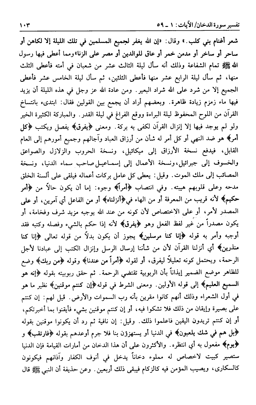 ومما أعطى فيها رسول الله صلى الله عليه وسلم تمام الشفاعة وذلك أنه سأل ليلة الثالث عشر من شعبان في أمته فأعطى الثلث منها، ثم سأل ليلة الرابع عشر منها فأعطى الثلثين، ثم سأل ليلة الخامس عشر فأعطى الجميع إلا من شرد على الله شراد البعير. ومن عادة الله عز وجل في هذه الليلة أن يزيد فيها ماء زمزم زيادة ظاهرة. وبعضهم أراد أن يجمع بين القولين فقال: ابتدئ بانتساخ القرآن من اللوح المحفوظ ليلة البراءة ووقع الفراغ في ليلة القدر. والمباركة الكثيرة الخير ولو لم يوجد فيها إلا إنزال القرآن لكفى به بركة. ومعنى يُفْرَقُ يفصل ويكتب كُلُّ أَمْرٍ هو ضد النهي أو كل أمر له شأن من أرزاق العباد وآجالهم وجميع أمورهم إلى العام القابل، فيدفع نسخة الأرزاق إلى ميكائيل، ونسخة الحروب والزلازل والصواعق والخسوف إلى جبرائيل، ونسخة الأعمال إلى إسماعيل صاحب سماء الدنيا، ونسخة المصائب إلى ملك الموت. وقيل: يعطى كل عامل بركات أعماله فيلقى على ألسنة الخلق مدحه وعلى قلوبهم هيبته. وفي انتصاب أَمْراً وجوه: إما أن يكون حالا من أَمْرٍ حَكِيمٍ لأنه قريب من المعرفة أو من الهاء في أَنْزَلْناهُ أو من الفاعل أي آمرين، أو على المصدر لأمر، أو على الاختصاص لأن كونه من عند الله يوجبه مزيد شرف وفخامة، أو يكون مصدرا من غير لفظ الفعل وهو يُفْرَقُ لأنه إذا حكم بالشيء وفصله وكتبه فقد أوجبه وأمر به قوله إِنَّا كُنَّا مُرْسِلِينَ يجوز أن يكون بدلا من قوله تعالى إِنَّا كُنَّا مُنْذِرِينَ أي أنزلنا القرآن لأن من شأننا إرسال الرسل وإنزال الكتب إلى عبادنا لأجل الرحمة، ويحتمل كونه تعليلا ليفرق، أو لقوله أَمْراً مِنْ عِنْدِنا وقوله مِنْ رَبِّكَ وضع للظاهر موضع الضمير إيذانا بأن الربوبية تقتضي الرحمة. ثم حقق ربوبيته بقوله إِنَّهُ هُوَ السَّمِيعُ الْعَلِيمُ إلى قوله الأولين. ومعنى الشرط في قوله إِنْ كُنْتُمْ مُوقِنِينَ نظير ما هو في أول الشعراء وذلك أنهم كانوا مقرين بأنه رب السموات والأرض. قيل لهم: إن كنتم على بصيرة وإيقان من ذلك فلا تشكوا فيه، أو إن كنتم موقنين بشيء فأيقنوا بما أخبرتكم، أو إن كنتم تريدون اليقين فاعلموا ذلك. وقيل: إن نافية ثم رد أن يكونوا موقنين بقوله بَلْ هُمْ فِي شَكٍّ يَلْعَبُونَ في الدنيا أو يستهزؤن بنا فلا جرم أوعدهم بقوله فَارْتَقِبْ ويَوْمَ مفعول به أي انتظره. والأكثرون على أن هذا الدخان من أمارات القيامة فإن الدنيا ستصير كبيت لاخصاص له مملوء دخانا يدخل في أنوف الكفار وآذانهم فيكونون كالسكارى، ويصيب المؤمن فيه كالزكام فيبقى ذلك أربعين.