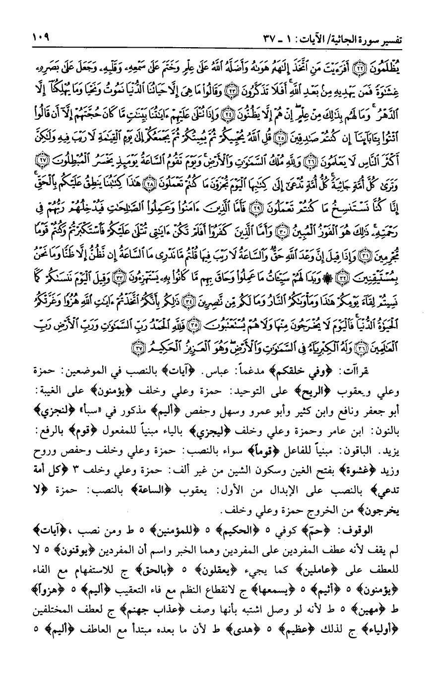 يزيد. الباقون: مبنيا للفاعل قَوْماً سواء بالنصب: حمزة وعلي وخلف وحفص وروح وزيد غشاوة بفتح الغين وسكون الشين من غير ألف: حمزة وعلي وخلف 3 كل أمة تدعي بالنصب على الإبدال من الأول: يعقوب الساعة بالنصب: حمزة لا يُخْرَجُونَ من الخروج حمزة وعلي وخلف.