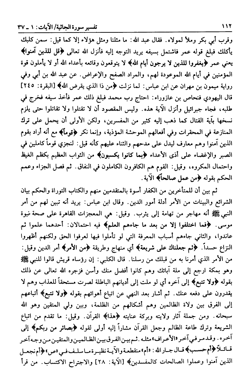 وقرب أبي بكر وملأ لمولاه. فقال عبد الله: ما مثلنا ومثل هؤلاء إلا كما قيل: سمن كلبك يأكلك فبلغ قوله عمر فاشتمل بسيفه يريد التوجه إليه فأنزل الله تعالى قُلْ لِلَّذِينَ آمَنُوا يعني عمر يَغْفِرُوا لِلَّذِينَ لا يَرْجُونَ أَيَّامَ اللَّهِ لا يتوقعون وقائعه بأعداء الله أو لا يأملون قوة المؤمنين في أيام الله الموعودة لهم، والمراد الصفح والإعراض. عن عبد الله بن أبي وفي رواية ميمون بن مهران عن ابن عباس: لما نزلت مَنْ ذَا الَّذِي يُقْرِضُ اللَّهَ [البقرة: 245] قال اليهودي فنحاص بن عازوراء: احتاج رب محمد فبلغ ذلك عمر فأخذ سيفه فخرج في طلبه، فجاء جبرائيل وأنزل الآية هذه. وليس المقصود أن لا تقتلوا ولا تقاتلوا حتى يلزم نسخها بآية القتال كما ذهب إليه كثير من المفسرين، ولكن الأولى أن يحمل على ترك المنازعة في المحقرات وفي أفعالهم الموحشة المؤذية، وإنما نكر قَوْماً مع أنه أراد بقوم الذين آمنوا وهم معارف ليدل على مدحهم والثناء عليهم كأنه قيل: لنجزي قوما كاملين في الصبر والإغضاء على أذى الأعداء بما يكسبون من الثواب العظيم بكظم الغيظ واحتمال المكروه، وقيل: القوم هم الكافرون الكاملون في النفاق. ثم فصل الجزاء وعمم الحكم بقوله مَنْ عَمِلَ صالِحاً الآية.