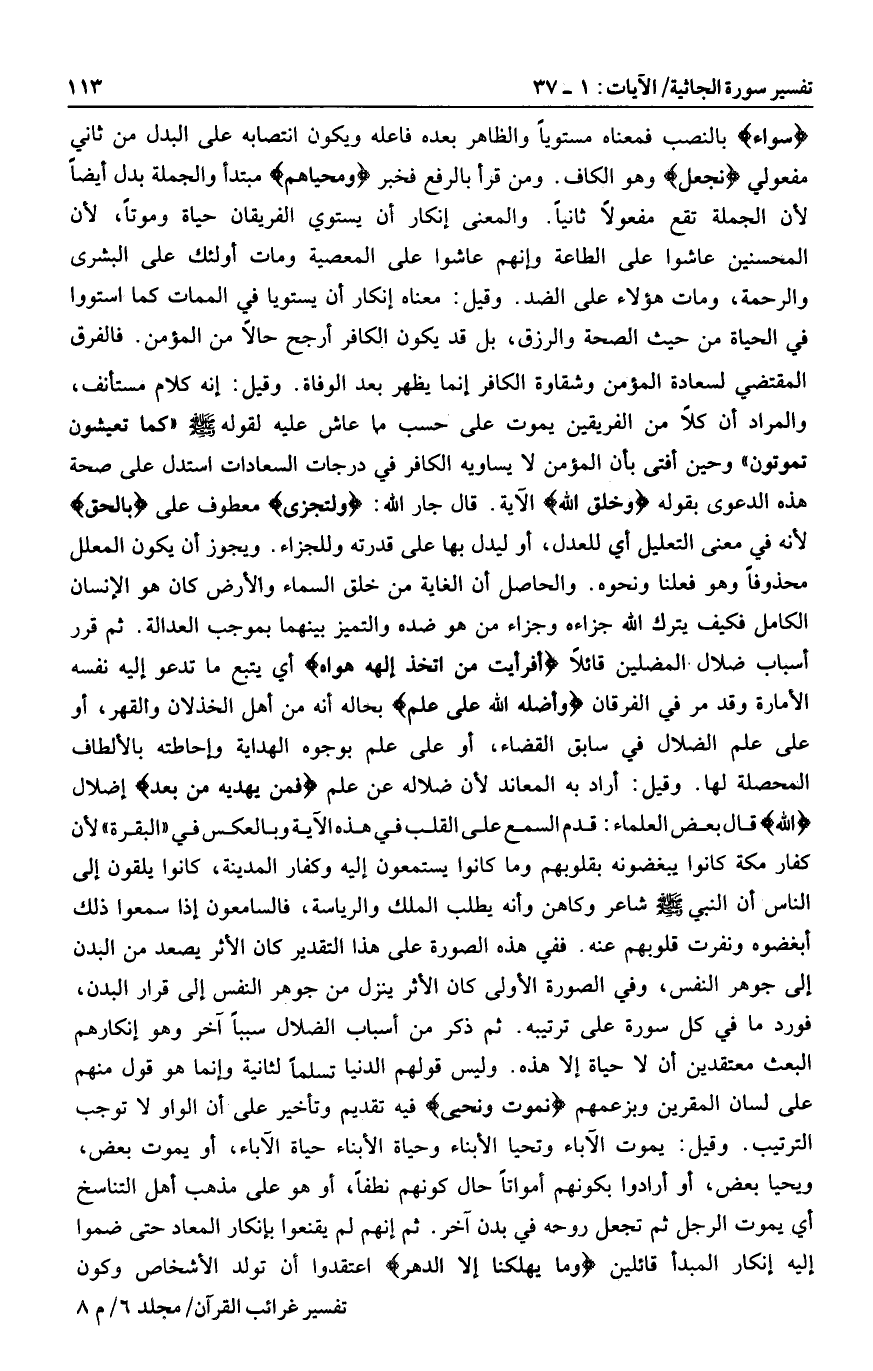 وحين أفتى بأن المؤمن لا يساويه الكافر في درجات السعادات استدل على صحة هذه الدعوى بقوله وَخَلَقَ اللَّهُ الآية. قال جار الله: وَلِتُجْزى معطوف على بِالْحَقِّ لأنه في معنى التعليل أي للعدل، أو ليدل بها على قدرته وللجزاء. ويجوز أن يكون المعلل محذوفا وهو فعلنا ونحوه. والحاصل أن الغاية من خلق السماء والأرض كان هو الإنسان الكامل فكيف يترك الله جزاءه وجزاء من هو ضده والتميز بينهما بموجب العدالة. ثم قرر أسباب ضلال المضلين قائلا أَفَرَأَيْتَ مَنِ اتَّخَذَ إِلهَهُ هَواهُ أي يتبع ما تدعو إليه نفسه الأمارة وقد مر في الفرقان وَأَضَلَّهُ اللَّهُ عَلى عِلْمٍ بحاله أنه من أهل الخذلان والقهر، أو على علم الضلال في سابق القضاء، أو على علم بوجوه الهداية وإحاطته بالألطاف المحصلة لها. وقيل: أراد به المعاند لأن ضلاله عن علم فَمَنْ يَهْدِيهِ مِنْ بَعْدِ إضلال اللَّهُ قال بعض العلماء: قدم السمع على القلب في هذه الآية وبالعكس في «البقرة» لأن كفار مكة كانوا يبغضونه بقلوبهم وما كانوا يستمعون إليه وكفار المدينة، كانوا يلقون إلى الناس أن النبي صلى الله عليه وسلم شاعر وكاهن وأنه يطلب الملك والرياسة، فالسامعون إذا سمعوا ذلك أبغضوه ونفرت قلوبهم عنه. ففي هذه الصورة على هذا التقدير كان الأثر يصعد من البدن إلى جوهر النفس، وفي الصورة الأولى كان الأثر ينزل من جوهر النفس إلى قرار البدن، فورد ما في كل سورة على ترتيبه. ثم ذكر من أسباب الضلال سببا آخر وهو إنكارهم البعث معتقدين أن لا حياة إلا هذه. وليس قولهم الدنيا تسلما لثانية وإنما هو قول منهم على لسان المقرين وبزعمهم نَمُوتُ وَنَحْيا فيه تقديم وتأخير على أن الواو لا توجب الترتيب. وقيل: يموت الآباء وتحيا الأبناء وحياة الأبناء حياة الآباء، أو يموت بعض، ويحيا بعض، أو أرادوا بكونهم أمواتا حال كونهم نطفا، أو هو على مذهب أهل التناسخ أي يموت الرجل ثم تجعل روحه في بدن آخر. ثم إنهم لم يقنعوا بإنكار المعاد حتى ضموا إليه إنكار المبدأ قائلين وَما يُهْلِكُنا إِلَّا الدَّهْرُ اعتقدوا أن تولد الأشخاص وكون