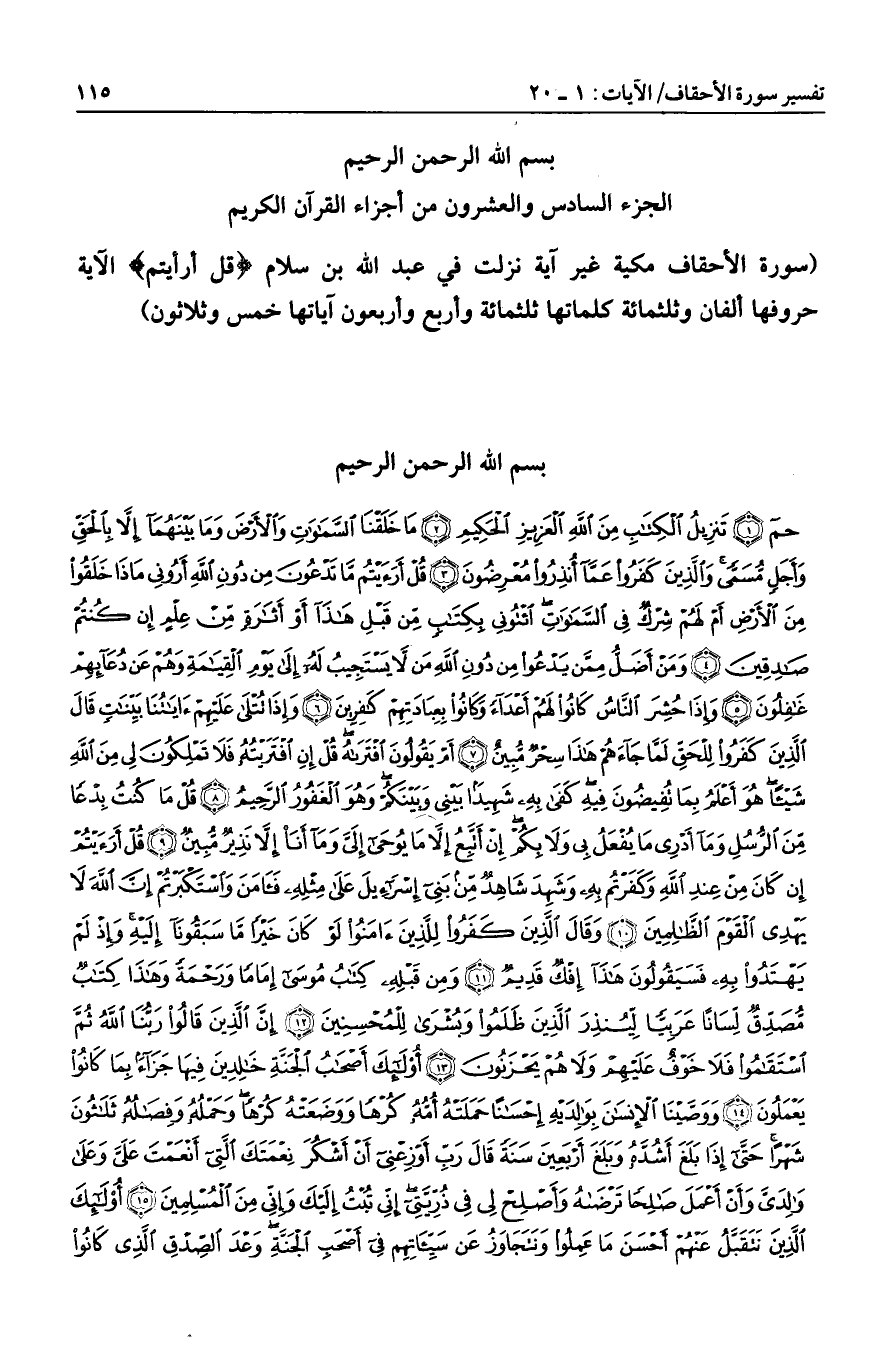 (مكية غير آية نزلت في عبد الله بن سلام قُلْ أَرَأَيْتُمْ الآية حروفها ألفان وثلاثمائة كلماتها ثلاثمائة وأربع وأربعون آياتها خمس وثلاثون)