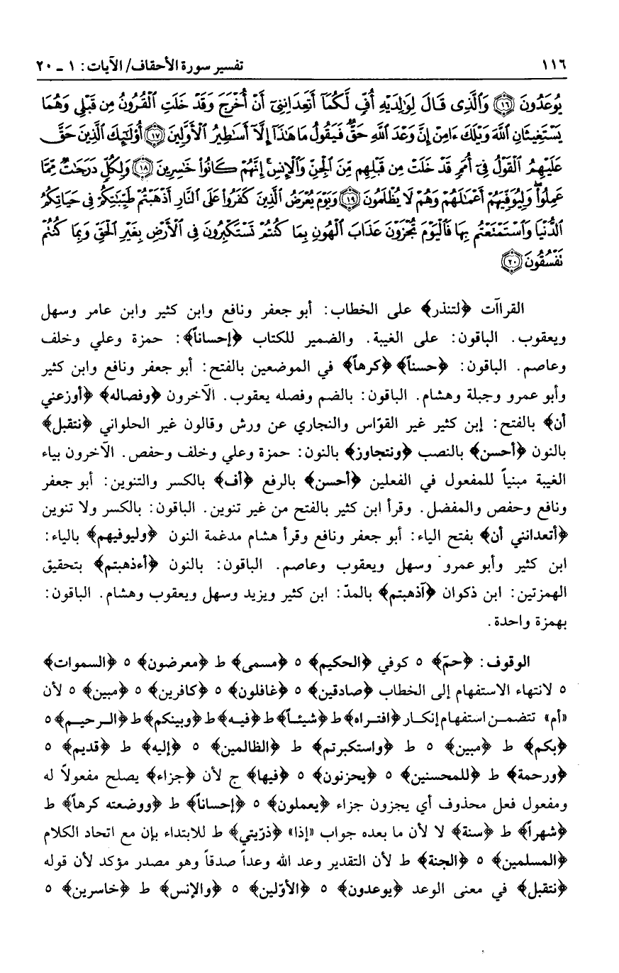 حم هـ كوفي الْحَكِيمِ هـ مُسَمًّى ط مُعْرِضُونَ هـ السَّماواتِ هـ لانتهاء الاستفهام إلى الخطاب صادِقِينَ هـ غافِلُونَ هـ كافِرِينَ هـ مُبِينٌ هـ لأن «أم» تتضمن استفهام إنكار افْتَراهُ ط شَيْئاً ط فِيهِ ط وَبَيْنَكُمْ ط الرَّحِيمُ هـ بِكُمْ ط مُبِينٌ هـ ط وَاسْتَكْبَرْتُمْ ط الظَّالِمِينَ هـ إِلَيْهِ ط قَدِيمٌ هـ وَرَحْمَةً ط لِلْمُحْسِنِينَ هـ يَحْزَنُونَ هـ فِيها ج لأن جَزاءً يصلح مفعولا له ومفعول فعل محذوف أي يجزون جزاء يَعْمَلُونَ هـ إِحْساناً ط وَوَضَعَتْهُ كُرْهاً ط شَهْراً ط سَنَةً لا لأن ما بعده جواب «إذا» ذُرِّيَّتِي ط للابتداء بإن مع اتحاد الكلام الْمُسْلِمِينَ هـ الْجَنَّةِ ط لأن التقدير وعد الله وعدا صدقا وهو مصدر مؤكد لأن قوله نَتَقَبَّلُ في معنى الوعد يُوعَدُونَ هـ الْأَوَّلِينَ هـ وَالْإِنْسِ ط خاسِرِينَ هـ