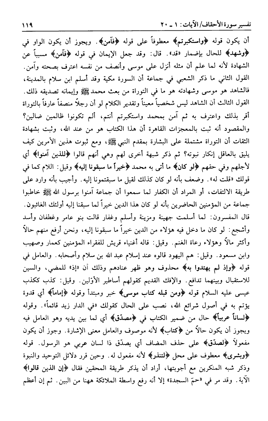أن يكون قوله وَاسْتَكْبَرْتُمْ معطوفا على قوله فَآمَنَ. ويجوز أن يكون الواو في وَشَهِدَ للحال بإضمار «قد» . قال: وقد جعل الإيمان في قوله فَآمَنَ مسببا عن الشهادة لأنه لما علم أن مثله أنزل على موسى وأنصف من نفسه اعترف بصحته وآمن.