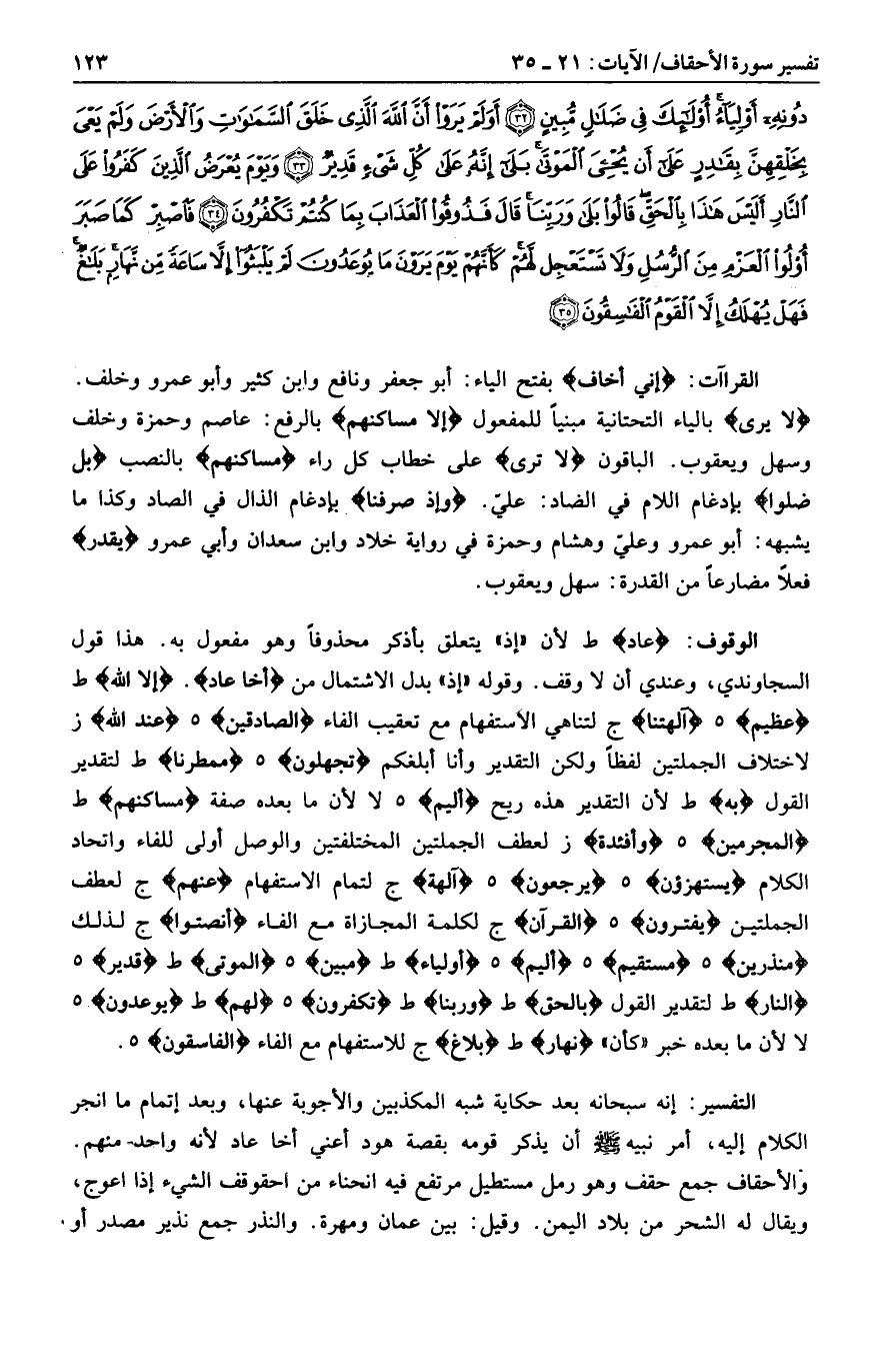 عادٍ ط لأن «إذ» يتعلق بأذكر محذوفا وهو مفعول به. هذا قول السجاوندي، وعندي أن لا وقف. وقوله «إذ» بدل الاشتمال من أَخا عادٍ. إِلَّا اللَّهَ ط عَظِيمٍ هـ آلِهَتِنا ج لتناهي الاستفهام مع تعقيب الفاء الصَّادِقِينَ هـ عِنْدَ اللَّهِ ز لاختلاف الجملتين لفظا ولكن التقدير وأنا أبلغكم تَجْهَلُونَ هـ مُمْطِرُنا ط لتقدير القول بِهِ ط لأن التقدير هذه ريح أَلِيمٌ هـ لا لأن ما بعده صفة مَساكِنُهُمْ ط الْمُجْرِمِينَ هـ وَأَفْئِدَةً ز لعطف الجملتين المختلفتين والوصل أولى للفاء واتحاد الكلام يَسْتَهْزِؤُنَ هـ يَرْجِعُونَ هـ آلِهَةً ج لتمام الاستفهام عَنْهُمْ ج لعطف الجملتين يَفْتَرُونَ هـ الْقُرْآنَ ج لكلمة المجازاة مع الفاء أَنْصِتُوا ج لذلك مُنْذِرِينَ هـ مُسْتَقِيمٍ هـ أَلِيمٍ هـ أَوْلِياءُ ط مُبِينٍ هـ الْمَوْتى ط قَدِيرٌ هـ النَّارِ ط لتقدير القول بِالْحَقِّ ط وَرَبِّنا ط تَكْفُرُونَ هـ لَهُمْ ط يُوعَدُونَ هـ لا لأن ما بعده خبر «كأن» نَهارٍ ط بَلاغٌ ج للاستفهام مع الفاء الْفاسِقُونَ هـ.