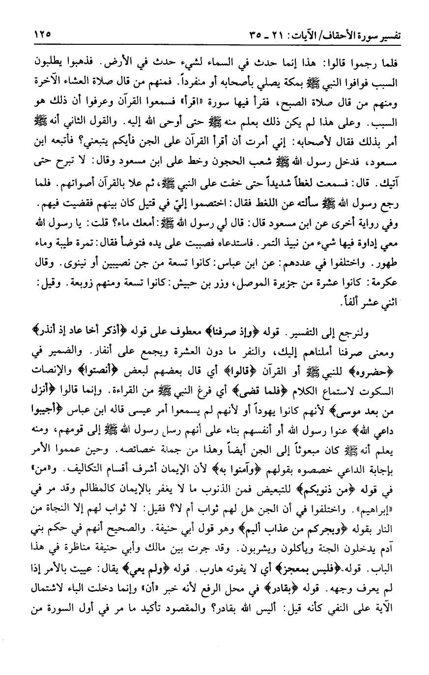ولنرجع إلى التفسير. قوله وَإِذْ صَرَفْنا معطوف على قوله اذْكُرْ أَخا عادٍ إِذْ أَنْذَرَ ومعنى صرفنا أملناهم إليك، والنفر ما دون العشرة ويجمع على أنفار. والضمير في حَضَرُوهُ للنبي صلى الله عليه وسلم أو القرآن قالُوا أي قال بعضهم لبعض أَنْصِتُوا والإنصاف السكوت لاستماع الكلام فَلَمَّا قُضِيَ أي فرغ النبي صلى الله عليه وسلم من القراءة. وإنما قالوا أُنْزِلَ مِنْ بَعْدِ مُوسى لأنهم كانوا يهودا أو لأنهم لم يسمعوا أمر عيسى قاله ابن عباس أَجِيبُوا داعِيَ اللَّهِ عنوا رسول الله أو أنفسهم بناء على أنهم رسل رسول الله صلى الله عليه وسلم إلى قومهم، ومنه يعلم أنه صلى الله عليه وسلم كان مبعوثا إلى الجن أيضا وهذا من جملة خصائصه. وحين عمموا الأمر بإجابة الداعي خصصوه بقولهم وَآمِنُوا بِهِ لأن الإيمان أشرف أقسام التكاليف. و «من» في قوله مِنْ ذُنُوبِكُمْ للتبعيض فمن الذنوب ما لا يغفر بالإيمان كالمظالم وقد مر في «إبراهيم» . واختلفوا في أن الجن هل لهم ثواب أم لا؟ فقيل: لا ثواب لهم إلا النجاة من النار بقوله وَيُجِرْكُمْ مِنْ عَذابٍ أَلِيمٍ وهو قول أبي حنيفة. والصحيح أنهم في حكم بني آدم يدخلون الجنة ويأكلون ويشربون. وقد جرت بين مالك وأبي حنيفة مناظرة في هذا الباب. قوله فَلَيْسَ بِمُعْجِزٍ أي لا يفوته هارب. قوله وَلَمْ يَعْيَ يقال: عييت بالأمر إذا لم يعرف وجهه. قوله بِقادِرٍ في محل الرفع لأنه خبر «أن» وإنما دخلت الباء لاشتمال الآية على النفي كأنه قيل: أليس الله بقادر؟ والمقصود تأكيد ما مر في أول السورة من