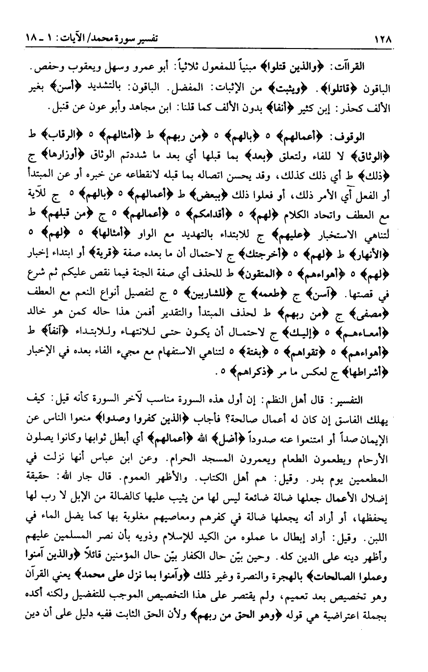 أَعْمالَهُمْ هـ بالَهُمْ هـ مِنْ رَبِّهِمْ ط أَمْثالَهُمْ هـ الرِّقابِ ط الْوَثاقَ لا للفاء ولتعلق بَعْدُ بما قبلها أي بعد ما شددتم الوثاق أَوْزارَها ج ذلِكَ ط أي ذلك كذلك، وقد يحسن اتصاله بما قبله لانقطاعه عن خبره أو عن المبتدأ أو الفعل أي الأمر ذلك، أو فعلوا ذلك بِبَعْضٍ ط أَعْمالَهُمْ هـ بالَهُمْ هـ ج للآية مع العطف واتحاد الكلام لَهُمْ هـ أَقْدامَكُمْ هـ أَعْمالَهُمْ هـ ج مِنْ قَبْلِهِمْ ط لتناهي الاستخبار عَلَيْهِمْ ج للابتداء بالتهديد مع الواو أَمْثالُها هـ لَهُمْ هـ الْأَنْهارُ ط لَهُمْ هـ أَخْرَجَتْكَ ج لاحتمال أن ما بعده صفة قَرْيَةٍ أو ابتداء إخبار لَهُمْ هـ أَهْواءَهُمْ هـ الْمُتَّقُونَ ط للحذف أي صفة الجنة فيما نقص عليكم ثم شرع في قصتها. آسِنٍ ج طَعْمُهُ ج لِلشَّارِبِينَ هـ ج لتفصيل أنواع النعم مع العطف مُصَفًّى ج مِنْ رَبِّهِمْ ط لحذف المبتدأ والتقدير أفمن هذا حاله كمن هو خالد أَمْعاءَهُمْ هـ إِلَيْكَ ج لاحتمال أن يكون حتى للانتهاء وللابتداء آنِفاً ط أَهْواءَهُمْ هـ تَقْواهُمْ هـ بَغْتَةً هـ لتناهي الاستفهام مع مجيء الفاء بعده في الإخبار أَشْراطُها ج لعكس ما مر ذِكْراهُمْ هـ.