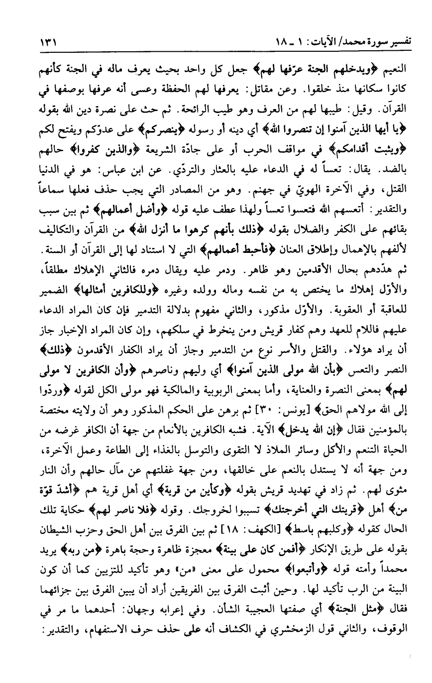 النعيم وَيُدْخِلُهُمُ الْجَنَّةَ عَرَّفَها لَهُمْ جعل كل واحد بحيث يعرف ماله في الجنة كأنهم كانوا سكانها منذ خلقوا. وعن مقاتل: يعرفها لهم الحفظة وعسى أنه عرفها بوصفها في القرآن. وقيل: طيبها لهم من العرف وهو طيب الرائحة. ثم حث على نصرة دين الله بقوله يا أَيُّهَا الَّذِينَ آمَنُوا إِنْ تَنْصُرُوا اللَّهَ أي دينه أو رسوله يَنْصُرْكُمْ على عدوّكم ويفتح لكم وَيُثَبِّتْ أَقْدامَكُمْ في مواقف الحرب أو على جادّة الشريعة وَالَّذِينَ كَفَرُوا حالهم بالضد. يقال: تعسا له في الدعاء عليه بالعثار والتردّي. عن ابن عباس: هو في الدنيا القتل، وفي الآخرة الهويّ في جهنم. وهو من المصادر التي يجب حذف فعلها سماعا والتقدير: أتعسهم الله فتعسوا تعسا ولهذا عطف عليه قوله وَأَضَلَّ أَعْمالَهُمْ ثم بين سبب بقائهم على الكفر والضلال بقوله ذلِكَ بِأَنَّهُمْ كَرِهُوا ما أَنْزَلَ اللَّهُ من القرآن والتكاليف لألفهم بالإهمال وإطلاق العنان فَأَحْبَطَ أَعْمالَهُمْ التي لا استناد لها إلى القرآن أو السنة.
