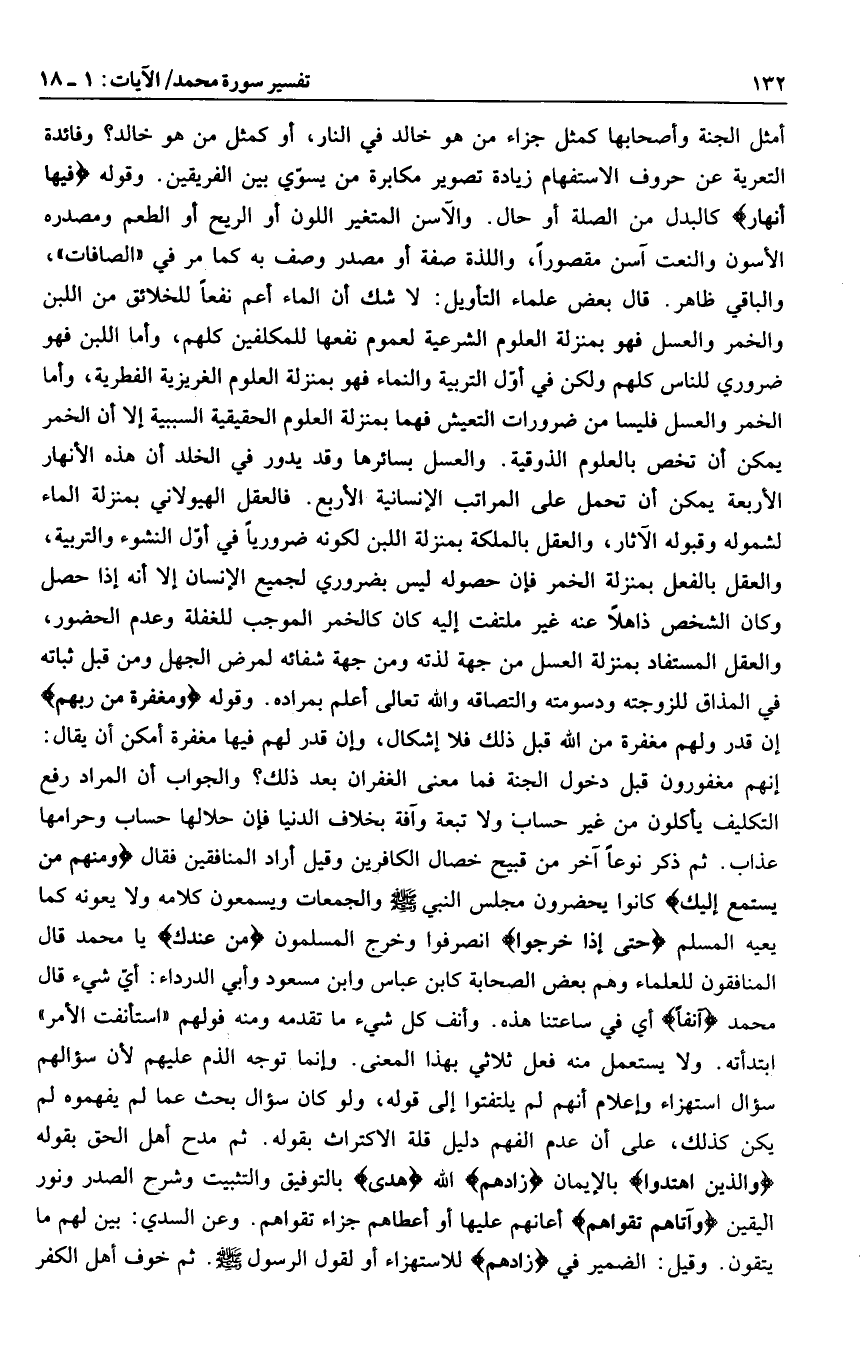 أمثل الجنة وأصحابها كمثل جزاء من هو خالد في النار، أو كمثل من هو خالد؟ وفائدة التعرية عن حروف الاستفهام زيادة تصوير مكابرة من يسوّي بين الفريقين. وقوله فِيها أَنْهارٌ كالبدل من الصلة أو حال. والآسن المتغير اللون أو الريح أو الطعم ومصدره الأسون والنعت آسن مقصورا، واللذة صفة أو مصدر وصف به كما مر في «الصافات» ، والباقي ظاهر. قال بعض علماء التأويل: لا شك أن الماء أعم نفعا للخلائق من اللبن والخمر والعسل فهو بمنزلة العلوم الشرعية لعموم نفعها للمكلفين كلهم، وأما اللبن فهو ضروري للناس كلهم ولكن في أوّل التربية والنماء فهو بمنزلة العلوم الغريزية الفطرية، وأما الخمر والعسل فليسا من ضرورات التعيش فهما بمنزلة العلوم الحقيقة السببية إلا أن الخمر يمكن أن تخص بالعلوم الذوقية. والعسل بسائرها وقد يدور في الخلد أن هذه الأنهار الأربعة يمكن أن تحمل على المراتب الإنسانية الأربع. فالعقل الهيولاني بمنزلة الماء لشموله وقبوله الآثار، والعقل بالملكة بمنزلة اللبن لكونه ضروريا في أوّل النشوء والتربية، والعقل بالفعل بمنزلة الخمر فإن حصوله ليس بضروري لجميع الإنسان إلا أنه إذا حصل وكان الشخص ذاهلا عنه غير ملتفت إليه كان كالخمر الموجب للغفلة وعدم الحضور، والعقل المستفاد بمنزلة العسل من جهة لذته ومن جهة شفائه لمرض الجهل ومن قبل ثباته في المذاق للزوجته ودسومته والتصاقه والله تعالى أعلم بمراده. وقوله وَمَغْفِرَةٌ مِنْ رَبِّهِمْ إن قدر ولهم مغفرة من الله قبل ذلك فلا إشكال، وإن قدر لهم فيها مغفرة أمكن أن يقال: