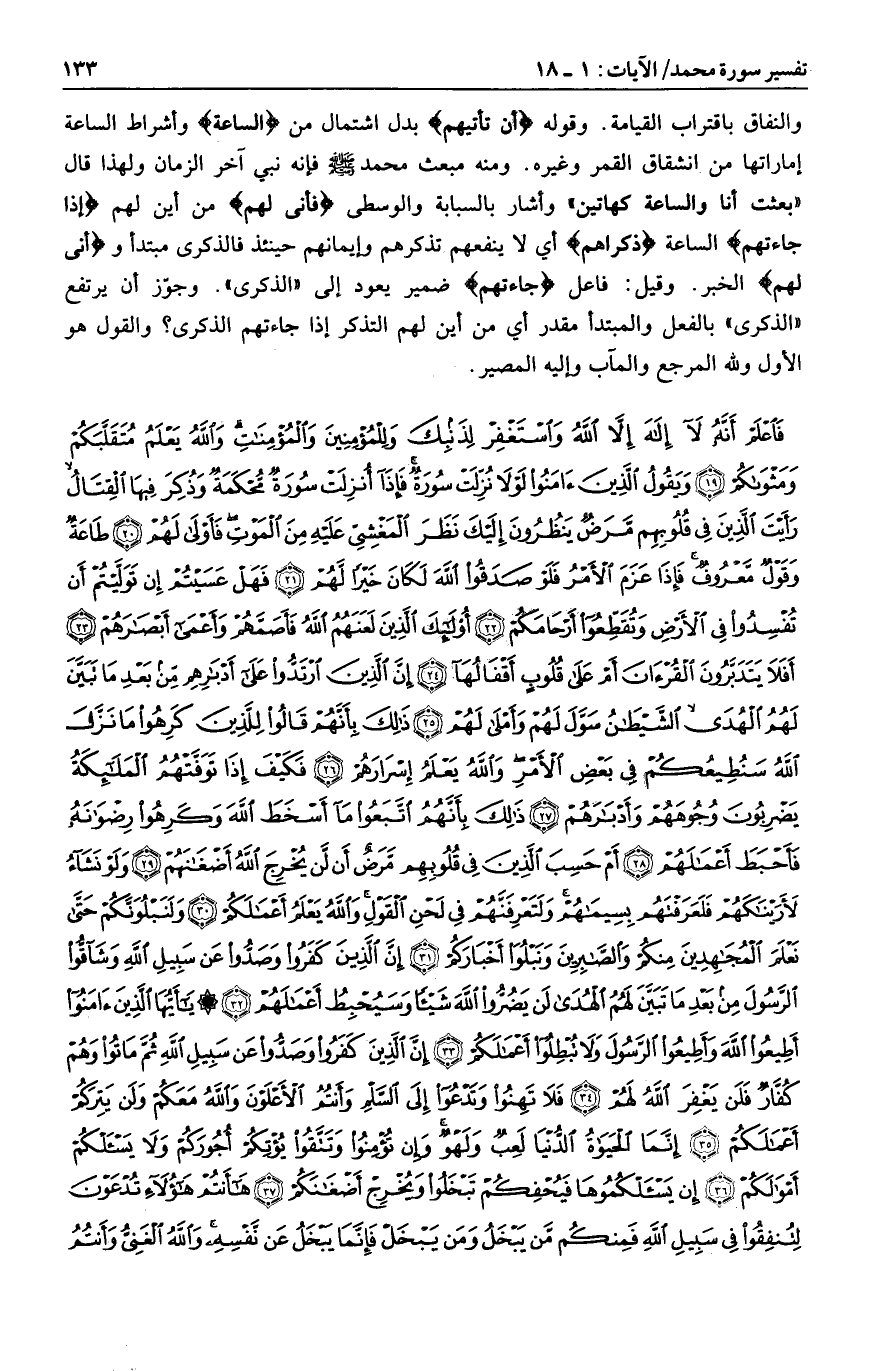 فَاعْلَمْ أَنَّهُ لا إِلهَ إِلاَّ اللَّهُ وَاسْتَغْفِرْ لِذَنْبِكَ وَلِلْمُؤْمِنِينَ وَالْمُؤْمِناتِ وَاللَّهُ يَعْلَمُ مُتَقَلَّبَكُمْ وَمَثْواكُمْ (19) وَيَقُولُ الَّذِينَ آمَنُوا لَوْلا نُزِّلَتْ سُورَةٌ فَإِذا أُنْزِلَتْ سُورَةٌ مُحْكَمَةٌ وَذُكِرَ فِيهَا الْقِتالُ رَأَيْتَ الَّذِينَ فِي قُلُوبِهِمْ مَرَضٌ يَنْظُرُونَ إِلَيْكَ نَظَرَ الْمَغْشِيِّ عَلَيْهِ مِنَ الْمَوْتِ فَأَوْلى لَهُمْ (20) طاعَةٌ وَقَوْلٌ مَعْرُوفٌ فَإِذا عَزَمَ الْأَمْرُ فَلَوْ صَدَقُوا اللَّهَ لَكانَ خَيْراً لَهُمْ (21) فَهَلْ عَسَيْتُمْ إِنْ تَوَلَّيْتُمْ أَنْ تُفْسِدُوا فِي الْأَرْضِ وَتُقَطِّعُوا أَرْحامَكُمْ (22) أُولئِكَ الَّذِينَ لَعَنَهُمُ اللَّهُ فَأَصَمَّهُمْ وَأَعْمى أَبْصارَهُمْ (23)