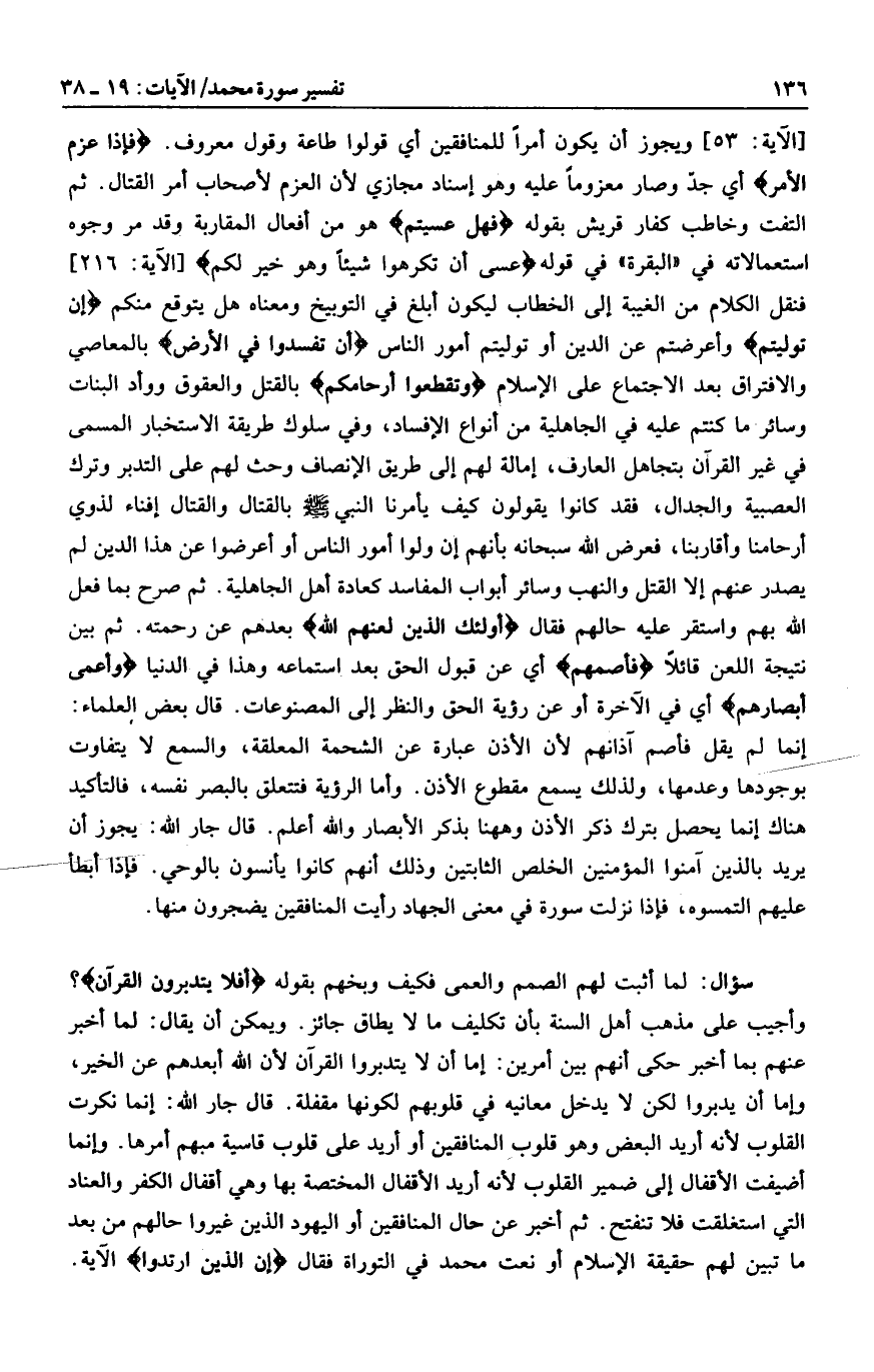 [الآية: 53] ويجوز أن يكون أمرا للمنافقين أي قولوا طاعة وقول معروف. فَإِذا عَزَمَ الْأَمْرُ أي جدّ وصار معزوما عليه وهو إسناد مجازي لأن العزم لأصحاب أمر القتال. ثم التفت وخاطب كفار قريش بقوله فَهَلْ عَسَيْتُمْ هو من أفعال المقاربة وقد مر وجوه استعمالاته في «البقرة» في قوله عَسى أَنْ تَكْرَهُوا شَيْئاً وَهُوَ خَيْرٌ لَكُمْ [الآية: 216] فنقل الكلام من الغيبة إلى الخطاب ليكون أبلغ في التوبيخ ومعناه هل يتوقع منكم إِنْ تَوَلَّيْتُمْ وأعرضتم عن الدين أو توليتم أمور الناس أَنْ تُفْسِدُوا فِي الْأَرْضِ بالمعاصي والافتراق بعد الاجتماع على الإسلام وَتُقَطِّعُوا أَرْحامَكُمْ بالقتل والعقوق ووأد البنات وسائر ما كنتم عليه في الجاهلية من أنواع الإفساد، وفي سلوك طريقة الاستخبار المسمى في غير القرآن بتجاهل العارف، إمالة لهم إلى طريق الإنصاف وحث لهم على التدبر وترك العصبية والجدال، فقد كانوا يقولون كيف يأمرنا النبي صلى الله عليه وسلم بالقتال والقتال إفناء لذوي أرحامنا وأقاربنا، فعرض الله سبحانه بأنهم إن ولوا أمور الناس أو أعرضوا عن هذا الدين لم يصدر عنهم إلا القتل والنهب وسائر أبواب المفاسد كعادة أهل الجاهلية. ثم صرح بما فعل الله بهم واستقر عليه حالهم فقال أُولئِكَ الَّذِينَ لَعَنَهُمُ اللَّهُ بعدهم عن رحمته. ثم بين نتيجة اللعن قائلا فَأَصَمَّهُمْ أي عن قبول الحق بعد استماعه وهذا في الدنيا وَأَعْمى أَبْصارَهُمْ أي في الآخرة أو عن رؤية الحق والنظر إلى المصنوعات. قال بعض العلماء: