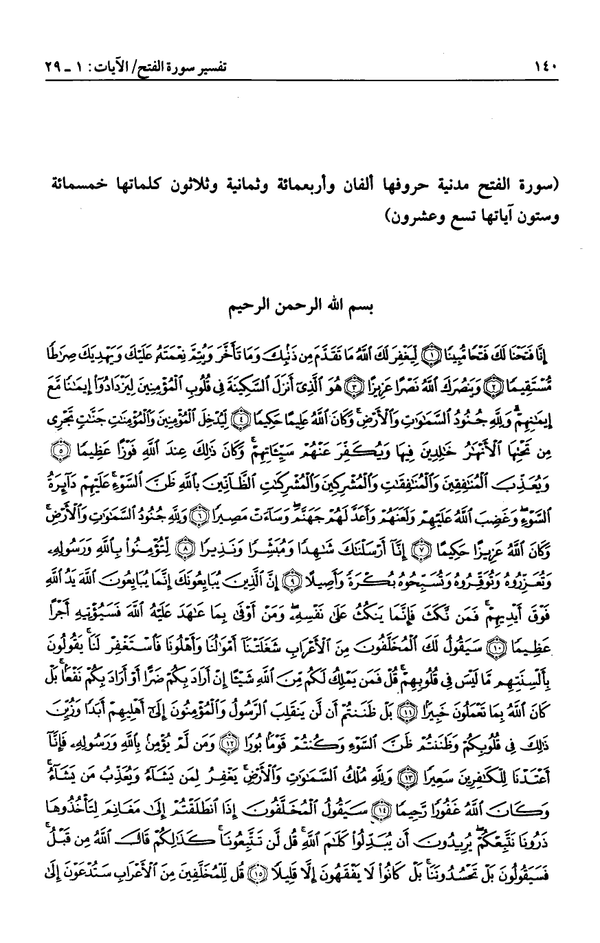 هُمُ الَّذِينَ كَفَرُوا وَصَدُّوكُمْ عَنِ الْمَسْجِدِ الْحَرامِ وَالْهَدْيَ مَعْكُوفاً أَنْ يَبْلُغَ مَحِلَّهُ وَلَوْلا رِجالٌ مُؤْمِنُونَ وَنِساءٌ مُؤْمِناتٌ لَمْ تَعْلَمُوهُمْ أَنْ تَطَؤُهُمْ فَتُصِيبَكُمْ مِنْهُمْ مَعَرَّةٌ بِغَيْرِ عِلْمٍ لِيُدْخِلَ اللَّهُ فِي رَحْمَتِهِ مَنْ يَشاءُ لَوْ تَزَيَّلُوا لَعَذَّبْنَا الَّذِينَ كَفَرُوا مِنْهُمْ عَذاباً أَلِيماً (25) إِذْ جَعَلَ الَّذِينَ كَفَرُوا فِي قُلُوبِهِمُ الْحَمِيَّةَ حَمِيَّةَ الْجاهِلِيَّةِ فَأَنْزَلَ اللَّهُ سَكِينَتَهُ عَلى رَسُولِهِ وَعَلَى الْمُؤْمِنِينَ وَأَلْزَمَهُمْ كَلِمَةَ التَّقْوى وَكانُوا أَحَقَّ بِها وَأَهْلَها وَكانَ اللَّهُ بِكُلِّ شَيْءٍ عَلِيماً (26) لَقَدْ صَدَقَ اللَّهُ رَسُولَهُ الرُّؤْيا بِالْحَقِّ لَتَدْخُلُنَّ الْمَسْجِدَ الْحَرامَ إِنْ شاءَ اللَّهُ آمِنِينَ مُحَلِّقِينَ رُؤُسَكُمْ وَمُقَصِّرِينَ لا تَخافُونَ فَعَلِمَ ما لَمْ تَعْلَمُوا فَجَعَلَ مِنْ دُونِ ذلِكَ فَتْحاً قَرِيباً (27) هُوَ الَّذِي أَرْسَلَ رَسُولَهُ بِالْهُدى وَدِينِ الْحَقِّ لِيُظْهِرَهُ عَلَى الدِّينِ كُلِّهِ وَكَفى بِاللَّهِ شَهِيداً (28) مُحَمَّدٌ رَسُولُ اللَّهِ وَالَّذِينَ مَعَهُ أَشِدَّاءُ عَلَى الْكُفَّارِ رُحَماءُ بَيْنَهُمْ تَراهُمْ رُكَّعاً سُجَّداً يَبْتَغُونَ فَضْلاً مِنَ اللَّهِ وَرِضْواناً سِيماهُمْ فِي وُجُوهِهِمْ مِنْ أَثَرِ السُّجُودِ ذلِكَ مَثَلُهُمْ فِي التَّوْراةِ وَمَثَلُهُمْ فِي الْإِنْجِيلِ كَزَرْعٍ أَخْرَجَ شَطْأَهُ فَآزَرَهُ فَاسْتَغْلَظَ فَاسْتَوى عَلى سُوقِهِ يُعْجِبُ الزُّرَّاعَ لِيَغِيظَ بِهِمُ الْكُفَّارَ وَعَدَ اللَّهُ الَّذِينَ آمَنُوا وَعَمِلُوا الصَّالِحاتِ مِنْهُمْ مَغْفِرَةً وَأَجْراً عَظِيماً (29)