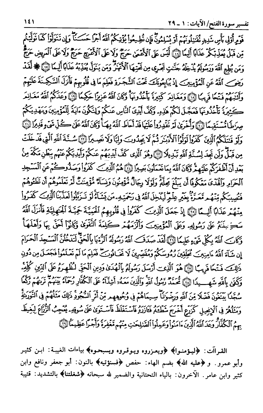 ليؤمنوا ويعزروه ويوقروه ويسبحوه بياءات الغيبة: ابن كثير وأبو عمرو. وعليه الله بضم الهاء: حفص فسنؤتيه بالنون: أبو جعفر ونافع وابن كثير وابن عامر. الآخرون: بالياء التحتانية والضمير لله سبحانه شغلتنا بالتشديد: قتيبة