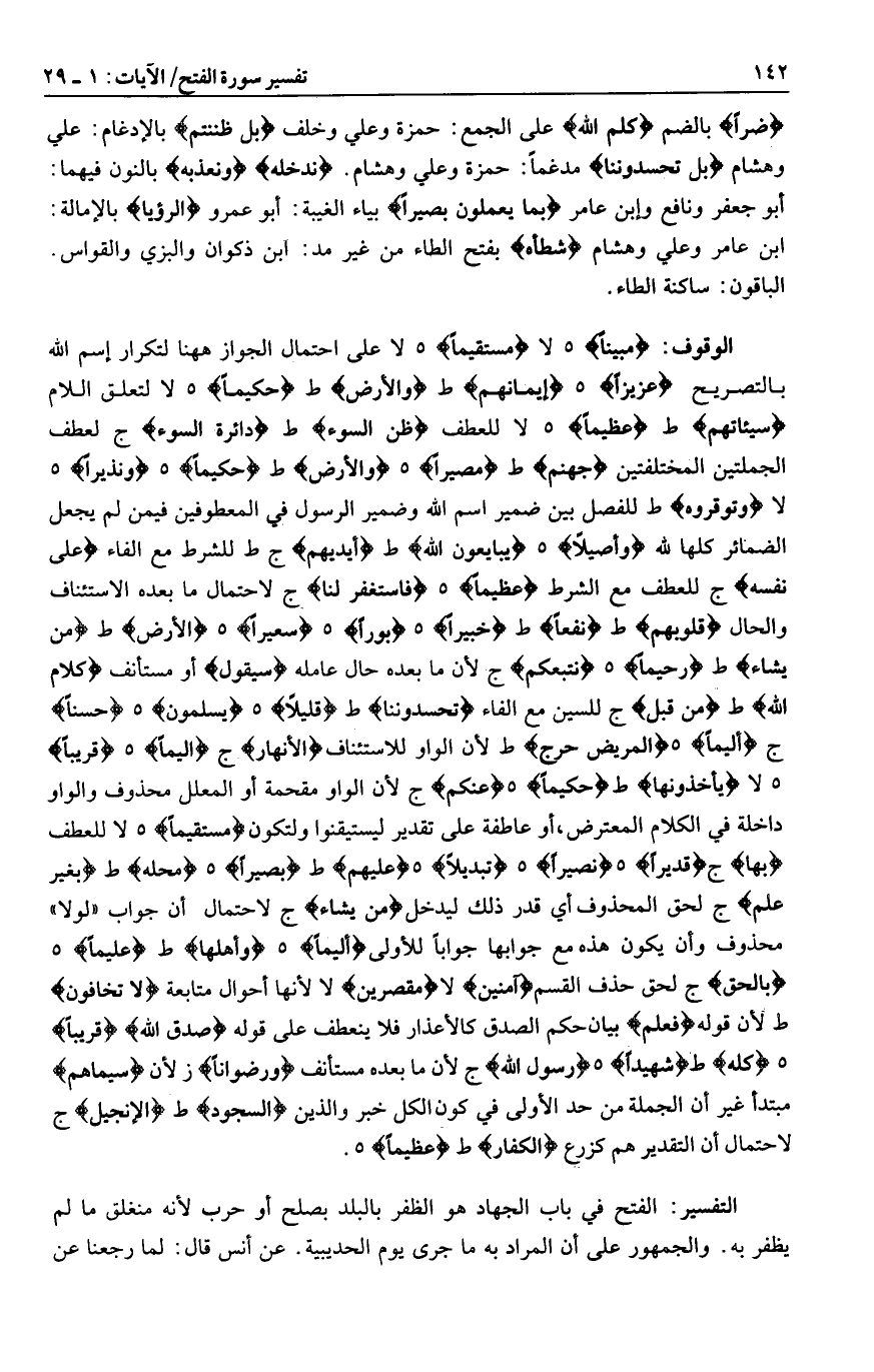 مُبِيناً هـ لا مُسْتَقِيماً هـ لا على احتمال الجواز هاهنا لتكرار اسم الله بالتصريح عَزِيزاً هـ إِيمانِهِمْ ط وَالْأَرْضِ ط حَكِيماً هـ لا لتعلق اللام سَيِّئاتِهِمْ ط عَظِيماً هـ لا للعطف ظَنَّ السَّوْءِ ط دائِرَةُ السَّوْءِ ج لعطف الجملتين المختلفتين جَهَنَّمَ ط مَصِيراً هـ وَالْأَرْضِ ط حَكِيماً هـ وَنَذِيراً هـ لا وَتُوَقِّرُوهُ ط للفصل بين ضمير اسم الله وضمير الرسول في المعطوفين فيمن لم يجعل الضمائر كلها لله وَأَصِيلًا هـ يُبايِعُونَ اللَّهَ ط أَيْدِيهِمْ ج ط للشرط مع الفاء عَلى نَفْسِهِ ج للعطف مع الشرط عَظِيماً هـ فَاسْتَغْفِرْ لَنا ج لاحتمال ما بعده الاستئناف والحال قُلُوبِهِمْ ط نَفْعاً ط خَبِيراً هـ بُوراً هـ سَعِيراً هـ الْأَرْضِ ط مَنْ يَشاءُ ط رَحِيماً هـ نَتَّبِعْكُمْ ج لأن ما بعده حال عامله سَيَقُولُ أو مستأنف كَلامَ اللَّهِ ط مِنْ قَبْلُ ج للسين مع الفاء تَحْسُدُونَنا ط قَلِيلًا هـ يُسْلِمُونَ هـ حَسَناً ج أَلِيماً هـ الْمَرِيضِ حَرَجٌ ط لأن الواو للاستئناف الْأَنْهارُ ج أَلِيماً هـ قَرِيباً هـ لا يَأْخُذُونَها ط حَكِيماً هـ عَنْكُمْ ج لأن الواو مقحمة أو المعلل محذوف والواو داخلة في الكلام المعترض، أو عاطفة على تقدير ليستيقنوا ولتكون مُسْتَقِيماً هـ لا للعطف بِها ج قَدِيراً هـ نَصِيراً هـ تَبْدِيلًا هـ عَلَيْهِمْ ط بَصِيراً هـ مَحِلَّهُ ط بِغَيْرِ عِلْمٍ ج لحق المحذوف أي قدر ذلك ليدخل مَنْ يَشاءُ ج لاحتمال أن جواب «لولا» محذوف وأن يكون هذه مع جوابها جوابا للأولى أَلِيماً هـ وَأَهْلَها ط عَلِيماً هـ بِالْحَقِّ ج لحق حذف القسم آمِنِينَ لا مُقَصِّرِينَ لا لأنها أحوال متابعة لا تَخافُونَ ط لأن قوله فَعَلِمَ بيان حكم الصدق كالأعذار فلا ينعطف على قوله صَدَقَ اللَّهُ قَرِيباً هـ كُلِّهِ ط شَهِيداً هـ رَسُولُ اللَّهِ ج لأن ما بعده مستأنف وَرِضْواناً ز لأن سِيماهُمْ مبتدأ غير أن الجملة من حد الأولى في كون الكل خبر والذين السُّجُودِ ط الْإِنْجِيلِ ج لاحتمال أن التقدير هم كزرع الْكُفَّارِ ط عَظِيماً هـ.