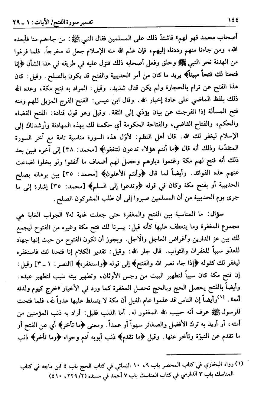 يريد ما كان من أمر الحديبية والفتح قد يكون بالصلح. وقيل: كان هذا الفتح عن ترام بالحجارة ولم يكن قتال شديد. وقيل: المراد به فتح مكة، وعده الله ذلك بلفظ الماضي على عادة إخبار الله. وقال ابن عيسى: الفتح الفرج المزيل للهم ومنه فتح المسألة إذا انفرجت عن بيان يؤدّي إلى الثقة. وقيل وهو قول قتادة: الفتح القضاء والحكم، والفتاح القاضي، والفتاحة الحكومة أي حكمنا لك بهذه المهادنة وأرشدناك إلى الإسلام ليغفر لك الله. قال أهل النظم: لأوّل هذه السورة مناسبة تامة مع آخر السورة المتقدّمة وذلك أنه قال ها أَنْتُمْ هؤُلاءِ تُدْعَوْنَ لِتُنْفِقُوا [محمد: 38] إلى آخره فبين بعد ذلك أنه فتح لهم مكة وغنموا ديارهم وحصل لهم أضعاف ما أنفقوا ولو بخلوا لضاعت عنهم هذه الفوائد. وأيضا لما قال وَأَنْتُمُ الْأَعْلَوْنَ [محمد: 35] بين برهانه بصلح الحديبية أو بفتح مكة وكان في قوله وَتَدْعُوا إِلَى السَّلْمِ [محمد: 35] إشارة إلى ما جرى يوم الحديبية من أن المسلمين صبروا إلى أن طلب المشركون الصلح.