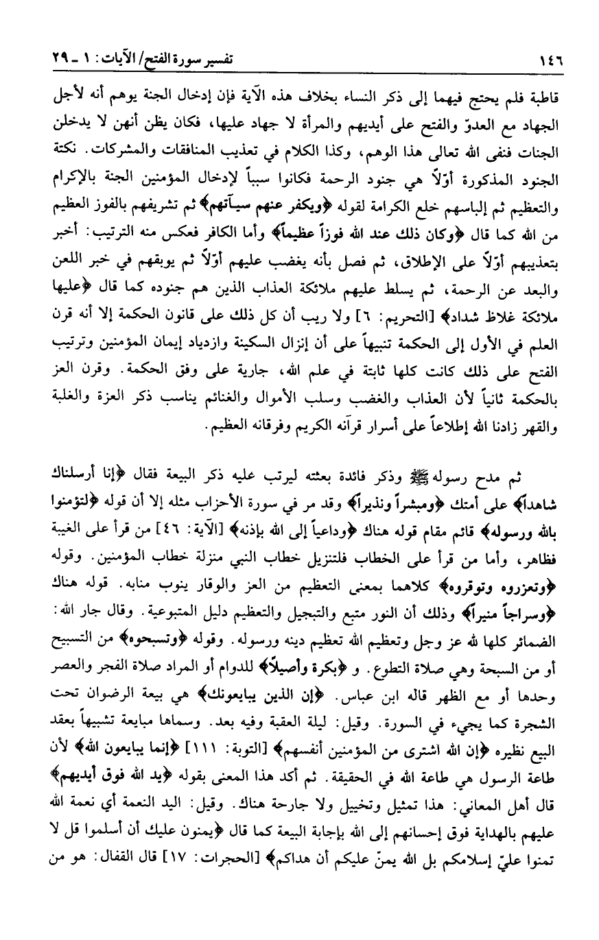 قاطبة فلم يحتج فيهما إلى ذكر النساء بخلاف هذه الآية فإن إدخال الجنة يوهم أنه لأجل الجهاد مع العدوّ والفتح على أيديهم والمرأة لا جهاد عليها، فكان يظن أنهن لا يدخلن الجنات فنفى الله تعالى هذا الوهم، وكذا الكلام في تعذيب المنافقات والمشركات. نكتة الجنود المذكورة أوّلا هي جنود الرحمة فكانوا سببا لإدخال المؤمنين الجنة بالإكرام والتعظيم ثم إلباسهم خلع الكرامة لقوله وَيُكَفِّرَ عَنْهُمْ سَيِّئاتِهِمْ ثم تشريفهم بالفوز العظيم من الله كما قال وَكانَ ذلِكَ عِنْدَ اللَّهِ فَوْزاً عَظِيماً وأما الكافر فعكس منه الترتيب: أخبر بتعذيبهم أوّلا على الإطلاق، ثم فصل بأنه يغضب عليهم أوّلا ثم يوبقهم في خبر اللعن والبعد عن الرحمة، ثم يسلط عليهم ملائكة العذاب الذين هم جنوده كما قال عَلَيْها مَلائِكَةٌ غِلاظٌ شِدادٌ [التحريم: 6] ولا ريب أن كل ذلك على قانون الحكمة إلا أنه قرن العلم في الأول إلى الحكمة تنبيها على أن إنزال السكينة وازدياد إيمان المؤمنين وترتيب الفتح على ذلك كانت كلها ثابتة في علم الله، جارية على وفق الحكمة. وقرن العز بالحكمة ثانيا لأن العذاب والغضب وسلب الأموال والغنائم يناسب ذكر العزة والغلبة والقهر زادنا الله إطلاعا على أسرار قرآنه الكريم وفرقانه العظيم.