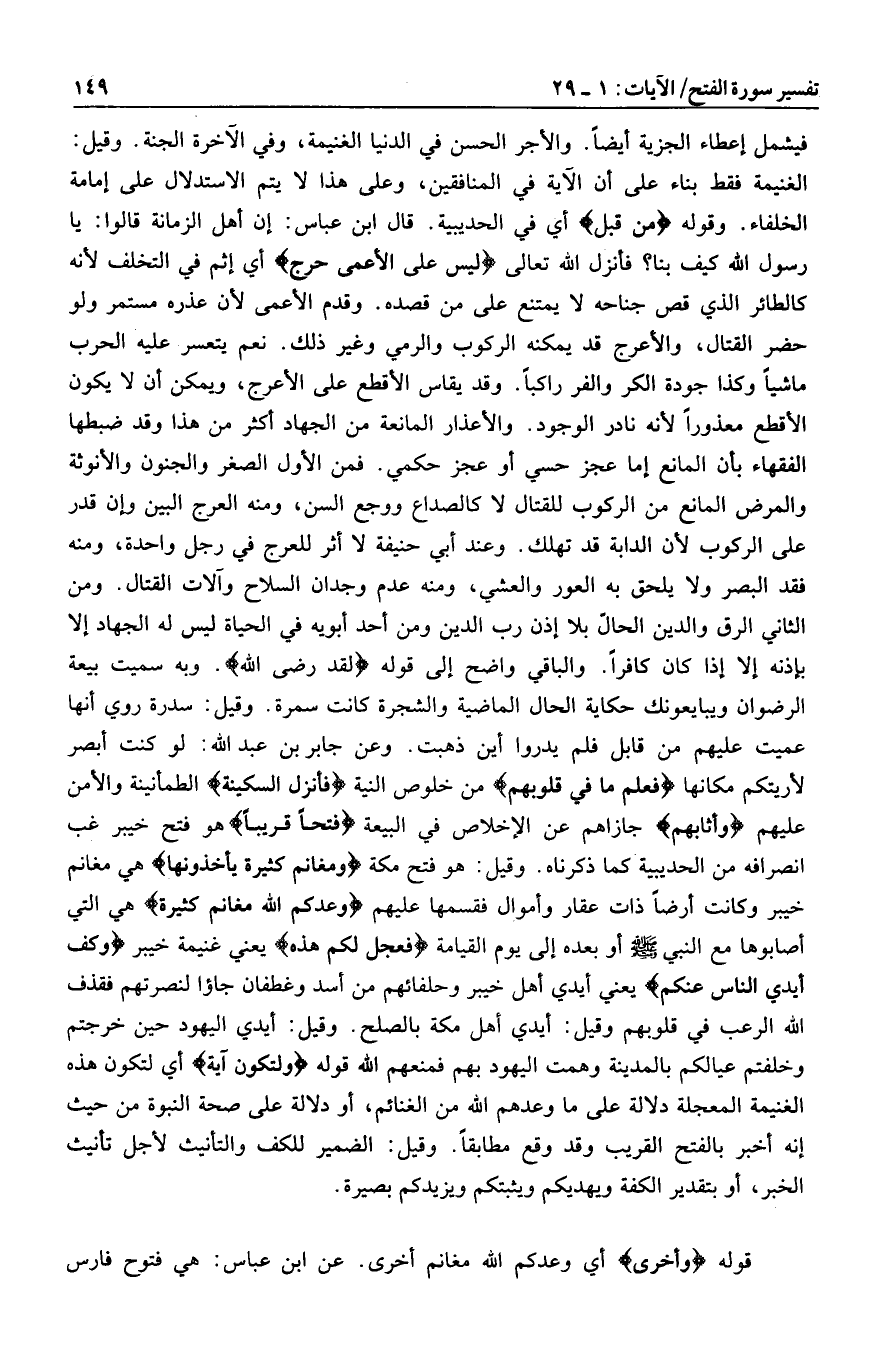 أي إثم في التخلف لأنه كالطائر الذي قص جناحه لا يمتنع على من قصده. وقدم الأعمى لأن عذره مستمر ولو حضر القتال، والأعرج قد يمكنه الركوب والرمي وغير ذلك. نعم يتعسر عليه الحرب ماشيا وكذا جودة الكر والفر راكبا. وقد يقاس الأقطع على الأعرج، ويمكن أن لا يكون الأقطع معذورا لأنه نادر الوجود. والأعذار المانعة من الجهاد أكثر من هذا وقد ضبطها الفقهاء بأن المانع إما عجز حسي أو عجز حكمي. فمن الأول الصغر والجنون والأنوثة والمرض المانع من الركوب للقتال لا كالصداع ووجع السن، ومنه العرج البين وإن قدر على الركوب لأن الدابة قد تهلك. وعند أبي حنيفة لا أثر للعرج في رجل واحدة، ومنه فقد البصر ولا يلحق به العور والعشي، ومنه عدم وجدان السلاح وآلات القتال. ومن الثاني الرق والدين الحالّ بلا إذن رب الدين ومن أحد أبويه في الحياة ليس له الجهاد إلا بإذنه إلا إذا كان كافرا. والباقي واضح إلى قوله لَقَدْ رَضِيَ اللَّهُ وبه سميت بيعة الرضوان ويبايعونك حكاية الحال الماضية والشجرة كانت سمرة. وقيل: سدرة روي أنها عميت عليهم من قابل فلم يدروا أين ذهبت. وعن جابر بن عبد الله: لو كنت أبصر لأريتكم مكانها فَعَلِمَ ما فِي قُلُوبِهِمْ من خلوص النية فَأَنْزَلَ السَّكِينَةَ الطمأنينة والأمن عليهم وَأَثابَهُمْ جازاهم عن الإخلاص في البيعة فَتْحاً قَرِيباً هو فتح خيبر غب انصرافه من الحديبية كما ذكرناه. وقيل: هو فتح مكة وَمَغانِمَ كَثِيرَةً يَأْخُذُونَها هي مغانم خيبر وكانت أرضا ذات عقار وأموال فقسمها عليهم وَعَدَكُمُ اللَّهُ مَغانِمَ كَثِيرَةً هي التي أصابوها مع النبي صلى الله عليه وسلم أو بعده إلى يوم القيامة فَعَجَّلَ لَكُمْ هذِهِ يعني غنيمة خيبر وَكَفَّ أَيْدِيَ النَّاسِ عَنْكُمْ يعني أيدي أهل خيبر وحلفائهم من أسد وغطفان جاؤا لنصرتهم فقذف الله الرعب في قلوبهم وقيل: أيدي أهل مكة بالصلح. وقيل: أيدي اليهود حين خرجتم وخلفتم عيالكم بالمدينة وهمت اليهود بهم فمنعهم الله قوله وَلِتَكُونَ آيَةً أي لتكون هذه الغنيمة المعجلة دلالة على ما وعدهم الله من الغنائم، أو دلالة على صحة النبوة من حيث إنه أخبر بالفتح القريب وقد وقع مطابقا. وقيل: الضمير للكف والتأنيث لأجل تأنيث الخبر، أو بتقدير الكفة ويهديكم ويثبتكم ويزيدكم بصيرة.