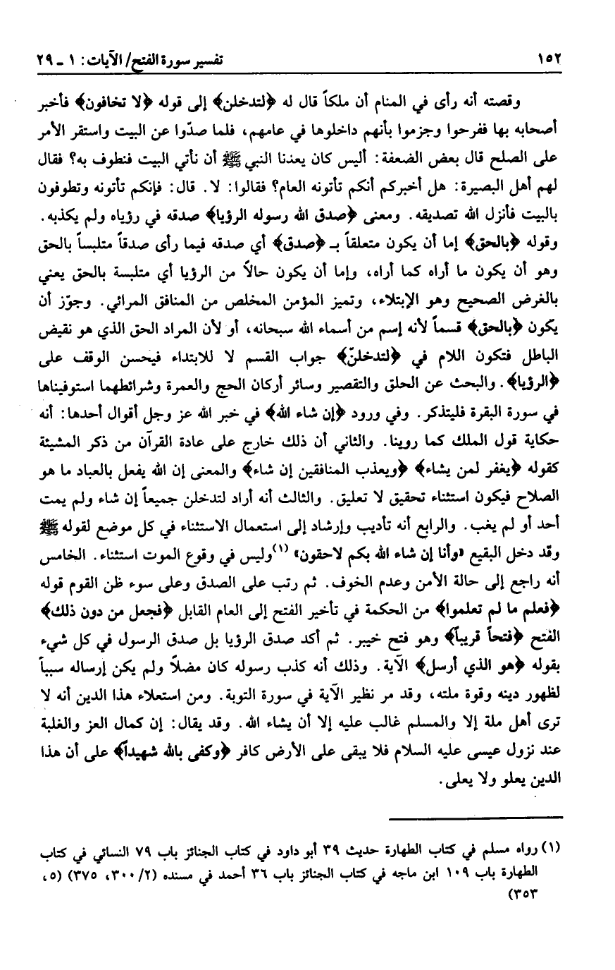 وقوله بِالْحَقِّ إما أن يكون متعلقا ب صَدَقَ أي صدقه فيما رأى صدقا متلبسا بالحق وهو أن يكون ما أراه كما أراه، وإما أن يكون حالا من الرؤيا أي متلبسة بالحق يعني بالغرض الصحيح وهو الابتلاء، وتميز المؤمن المخلص من المنافق المرائي. وجوّز أن يكون بِالْحَقِّ قسما لأنه اسم من أسماء الله سبحانه، أو لأن المراد الحق الذي هو نقيض الباطل فتكون اللام في لَتَدْخُلُنَّ جواب القسم لا للابتداء فيحسن الوقف على الرُّؤْيا. والبحث عن الحلق والتقصير وسائر أركان الحج والعمرة وشرائطهما استوفيناها في سورة البقرة فليتذكر. وفي ورود إِنْ شاءَ اللَّهُ في خبر الله عز وجل أقوال أحدها: أنه حكاية قول الملك كما روينا. والثاني أن ذلك خارج على عادة القرآن من ذكر المشيئة كقوله يَغْفِرُ لِمَنْ يَشاءُ وَيُعَذِّبَ الْمُنافِقِينَ إِنْ شاءَ والمعنى إن الله يفعل بالعباد ما هو الصلاح فيكون استثناء تحقيق لا تعليق. والثالث أنه أراد لتدخلن جميعا إن شاء ولم يمت أحد أو لم يغب. والرابع أنه تأديب وإرشاد إلى استعمال الاستثناء في كل موضع