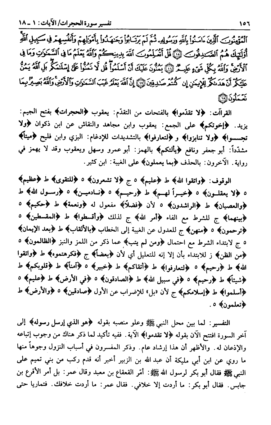 وَاتَّقُوا اللَّهَ ط عَلِيمٌ هـ ج لا تَشْعُرُونَ هـ لِلتَّقْوى ط عَظِيمٌ هـ لا يَعْقِلُونَ هـ خَيْراً لَهُمْ ط رَحِيمٌ هـ نادِمِينَ هـ رَسُولَ اللَّهِ ط وَالْعِصْيانَ ط الرَّاشِدُونَ هـ لأن فَضْلًا مفعول له وَنِعْمَةً ط حَكِيمٌ هـ بَيْنَهُما ج للشرط مع الفاء أَمْرِ اللَّهِ ج لذلك وَأَقْسِطُوا ط الْمُقْسِطِينَ هـ تُرْحَمُونَ هـ مِنْهُنَّ ج للعدول عن الغيبة إلى الخطاب بِالْأَلْقابِ ط بَعْدَ الْإِيمانِ هـ ج لابتداء الشرط مع احتمال وَمَنْ لَمْ يَتُبْ عما ذكر من اللمز والنبز الظَّالِمُونَ هـ مِنَ الظَّنِّ ز للابتداء بأن إلا إنه للتعليل أي لأن بَعْضاً ج فَكَرِهْتُمُوهُ ط وَاتَّقُوا اللَّهَ ط رَحِيمٌ هـ لِتَعارَفُوا ط أَتْقاكُمْ ط خَبِيرٌ هـ آمَنَّا ط قُلُوبِكُمْ ط شَيْئاً ط رَحِيمٌ هـ فِي سَبِيلِ اللَّهِ ط الصَّادِقُونَ هـ فِي الْأَرْضِ ط عَلِيمٌ هـ أَسْلَمُوا ط إِسْلامَكُمْ ج لأن «بل» للإضراب عن الأول صادِقِينَ هـ وَالْأَرْضِ ط تَعْمَلُونَ هـ.