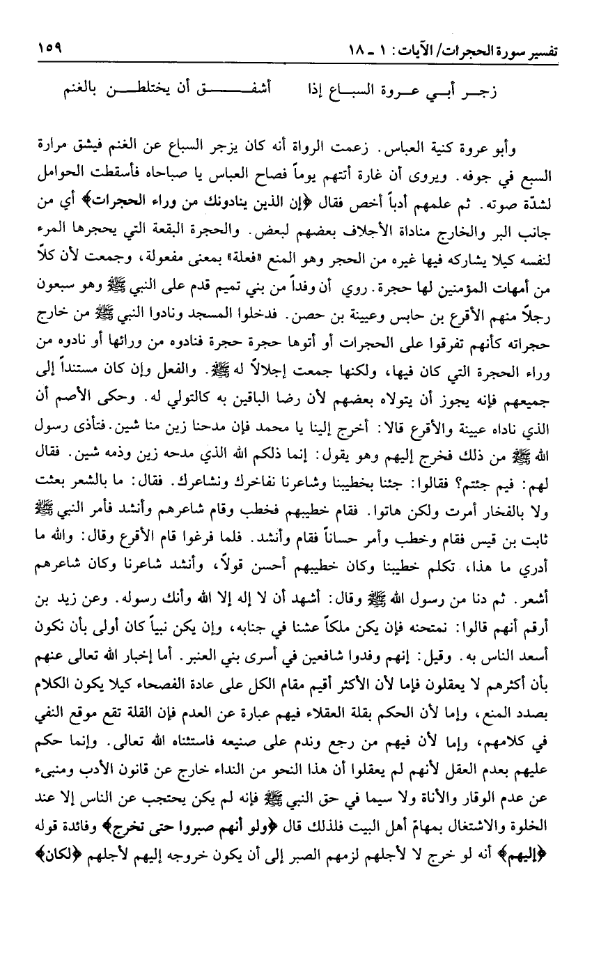 وأبو عروة كنية العباس. زعمت الرواة أنه كان يزجر السباع عن الغنم فيشق مرارة السبع في جوفه. ويروى أن غارة أتتهم يوما فصاح العباس يا صباحاه فأسقطت الحوامل لشدّة صوته. ثم علمهم أدبا أخص فقال إِنَّ الَّذِينَ يُنادُونَكَ مِنْ وَراءِ الْحُجُراتِ أي من جانب البر والخارج مناداة الأجلاف بعضهم لبعض. والحجرة البقعة التي يحجرها المرء لنفسه كيلا يشاركه فيها غيره من الحجر وهو المنع «فعلة» بمعنى مفعولة، وجمعت لأن كلا من أمهات المؤمنين لها حجرة. روي أن وفدا من بني تميم قدم على النبي صلى الله عليه وسلم وهو سبعون رجلا منهم الأقرع بن حابس وعيينة بن حصن. فدخلوا المسجد ونادوا النبي صلى الله عليه وسلم من خارج حجراته كأنهم تفرقوا على الحجرات أو أتوها حجرة حجرة فنادوه من ورائها أو نادوه من وراء الحجرة التي كان فيها، ولكنها جمعت إجلالا له صلى الله عليه وسلم. والفعل وإن كان مستندا إلى جميعهم فإنه يجوز أن يتولاه بعضهم لأن رضا الباقين به كالتولي له.