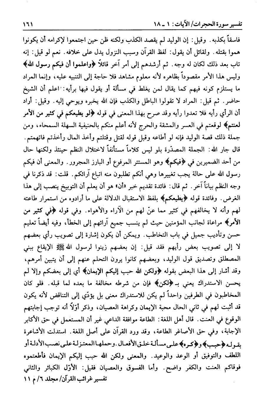 قال جار الله: الجملة المصدّرة بلو ليس كلاما مستأنفا لاختلال النظم حينئذ ولكنها حال من أحد الضميرين في فِيكُمْ وهو المستتر المرفوع أو البارز المجرور. والمعنى أن فيكم رسول الله على حالة يجب تغييرها وهي أنكم تطلبون منه اتباع آرائكم. قلت: قد ذكرنا في وجه النظم بيانا آخر. ثم قال: فائدة تقديم خبر «أن» هو أن يعلم أن التوبيخ ينصب إلى هذا الغرض. وفائدة قوله يُطِيعُكُمْ بلفظ الاستقبال الدلالة على ما أرادوه من استمرار طاعته لهم وأنه لا يخالفهم في كثير مما عنّ لهم من الآراء والأهواء. وفي قوله فِي كَثِيرٍ مِنَ الْأَمْرِ مراعاة لجانب المؤمنين حيث لم ينسب جميع آرائهم إلى الخطأ، وفيه أيضا تعليم حسن وتأديب جميل في باب التخاطب. ويمكن أن يكون إشارة إلى تصويب رأي بعضهم لا إلى تصويب بعض رأيهم فقد قيل: إن بعضهم زينوا لرسول الله صلى الله عليه وسلم الإيقاع ببني المصطلق وتصديق قول الوليد، وبعضهم كانوا يرون التحلم عنهم إلى أن يتبين أمرهم، وقد أشار إلى هذا البعض بقوله وَلكِنَّ اللَّهَ حَبَّبَ إِلَيْكُمُ الْإِيمانَ أي إلى بعضكم وإلا لم يحسن الاستدراك يعني ب لكِنَّ فإن من شرطه مخالفة ما بعده لما قبله. فلو كان المخاطبون في الطرفين واحدا لم يكن للاستدراك معنى بل يؤدّي إلى التناقض لأنه يكون قد أثبت لهم في ثاني الحال محبة الإيمان وكراهة العصيان، وذكر أوّلا أنه توجب إجابتهم الوقوع في العنت. قال أهل اللغة: الطاعة موافقة الداعي غير أن المستعمل في حق الأكابر الإجابة، وفي حق الأصاغر الطاعة، وقد ورد القرآن على أصل اللغة. استدلت الأشاعرة بقوله حَبَّبَ وكَرَّهَ على مسألة خلق الأفعال. وحملها المعتزلة على نصب الأدلة أو اللطف والتوفيق أو الوعد والوعيد. والمعنى ولكن الله حبب إليكم الإيمان فأطعتموه فوقاكم العنت والكفر واضح. وأما الفسوق والعصيان فقيل: الأوّل الكبائر والثاني