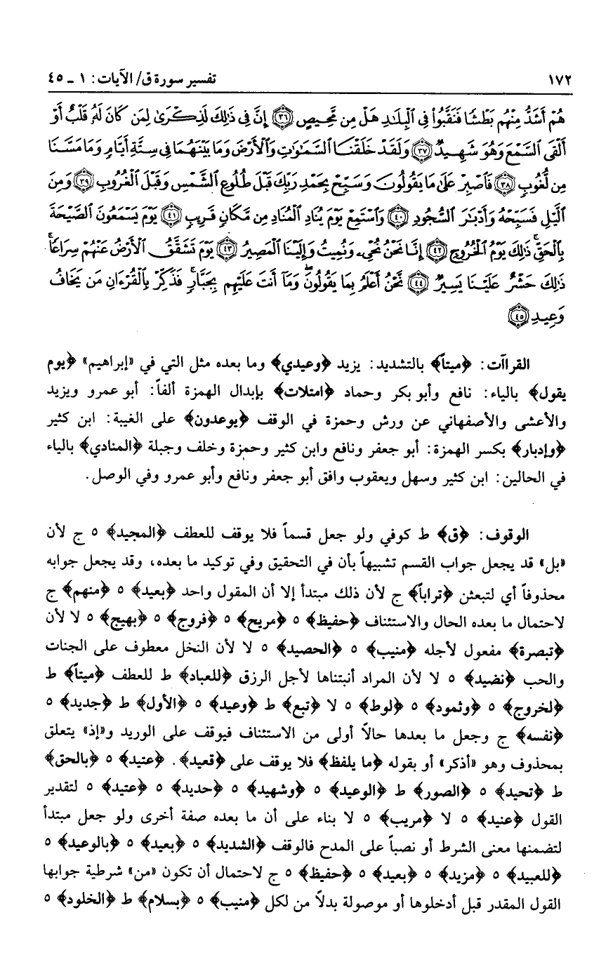 ق ط كوفي ولو جعل قسما فلا يوقف للعطف الْمَجِيدِ هـ ج لأن «بل» قد يجعل جواب القسم تشبيها بأن في التحقيق وفي توكيد ما بعده، وقد يجعل جوابه محذوفا أي لتبعثن تُراباً ج لأن ذلك مبتدأ إلا أن المقول واحد بَعِيدٌ هـ مِنْهُمْ ج لاحتمال ما بعده الحال والاستئناف حَفِيظٌ هـ مَرِيجٍ هـ فُرُوجٍ هـ بَهِيجٍ هـ لا لأن تَبْصِرَةً مفعول لأجله مُنِيبٍ هـ الْحَصِيدِ هـ لا لأن النخل معطوف على الجنات والحب نَضِيدٌ هـ لا لأن المراد أنبتناها لأجل الرزق لِلْعِبادِ ط للعطف مَيْتاً ط الْخُرُوجُ هـ وَثَمُودُ هـ لُوطٍ هـ لا تُبَّعٍ ط وَعِيدِ هـ الْأَوَّلِ ط جَدِيدٍ هـ نَفْسُهُ ج وجعل ما بعدها حالا أولى من الاستئناف فيوقف على الوريد و «إذ» يتعلق بمحذوف وهو «أذكر» أو بقوله ما يَلْفِظُ فلا يوقف على قَعِيدٌ. عَتِيدٌ هـ بِالْحَقِّ ط تَحِيدُ هـ الصُّورِ ط الْوَعِيدِ هـ وَشَهِيدٌ هـ حَدِيدٌ هـ عَتِيدٌ هـ لتقدير القول عَنِيدٍ هـ لا مُرِيبٍ هـ لا بناء على أن ما بعده صفة أخرى ولو جعل مبتدأ لتضمنها معنى الشرط أو نصبا على المدح فالوقف الشَّدِيدِ هـ بَعِيدٍ هـ بِالْوَعِيدِ هـ لِلْعَبِيدِ هـ مَزِيدٍ هـ بَعِيدٍ هـ حَفِيظٍ هـ ج لاحتمال أن تكون «من» شرطية جوابها القول المقدر قبل أدخلوها أو موصولة بدلا من لكل مُنِيبٍ هـ بِسَلامٍ ط الْخُلُودِ هـ