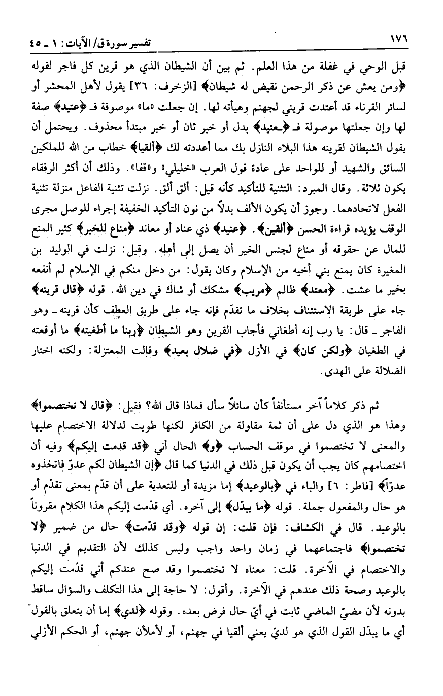 قبل الوحي في غفلة من هذا العلم. ثم بين أن الشيطان الذي هو قرين كل فاجر لقوله وَمَنْ يَعْشُ عَنْ ذِكْرِ الرَّحْمنِ نُقَيِّضْ لَهُ شَيْطاناً [الزخرف: 36] يقول لأهل المحشر أو لسائر القرناء قد أعتدت قريني لجهنم وهيأته لها. إن جعلت «ما» موصوفة ف عَتِيدٌ صفة لها وإن جعلتها موصولة ف عَتِيدٌ بدل أو خبر ثان أو خبر مبتدأ محذوف. ويحتمل أن يقول الشيطان لقرينه هذا البلاء النازل بك مما أعددته لك أَلْقِيا خطاب من الله للملكين السائق والشهيد أو للواحد على عادة قول العرب «خليلي» و «قفا» . وذلك أن أكثر الرفقاء يكون ثلاثة. وقال المبرد: التثنية للتأكيد كأنه قيل: ألق ألق: نزلت تثنية الفاعل منزلة تثنية الفعل لاتحادهما. وجوز أن يكون الألف بدلا من نون التأكيد الخفيفة إجراء للوصل مجرى الوقف يؤيده قراءة الحسن ألقين. عَنِيدٍ ذي عناد أو معاند مَنَّاعٍ لِلْخَيْرِ كثير المنع للمال عن حقوقه أو مناع لجنس الخير أن يصل إلى أهله. وقيل: نزلت في الوليد بن المغيرة كان يمنع بني أخيه من الإسلام وكان يقول: من دخل منكم في الإسلام لم أنفعه بخير ما عشت. مُعْتَدٍ ظالم مُرِيبٍ مشكك أو شاك في دين الله. قوله قالَ قَرِينُهُ جاء على طريقة الاستئناف بخلاف ما تقدّم فإنه جاء على طريق العطف كأن قرينه- وهو الفاجر- قال: يا رب إنه أطغاني فأجاب القرين وهو الشيطان رَبَّنا ما أَطْغَيْتُهُ ما أوقعته في الطغيان وَلكِنْ كانَ في الأزل فِي ضَلالٍ بَعِيدٍ وقالت المعتزلة: ولكنه اختار الضلالة على الهدى.