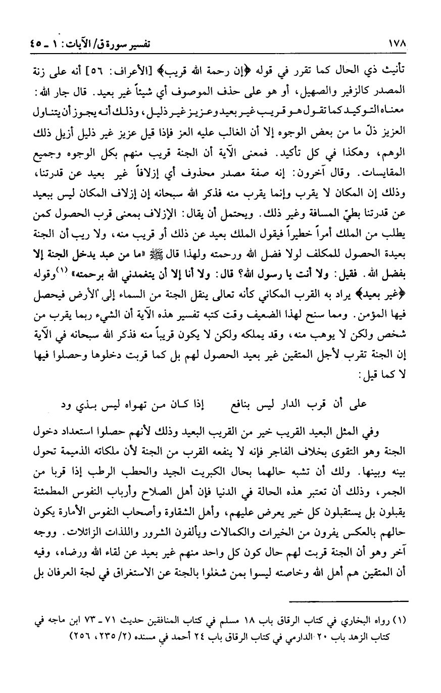 وقوله غَيْرَ بَعِيدٍ يراد به القرب المكاني كأنه تعالى ينقل الجنة من السماء إلى الأرض فيحصل فيها المؤمن. ومما سنح لهذا الضعيف وقت كتبه تفسير هذه الآية أن الشيء ربما يقرب من شخص ولكن لا يوهب منه، وقد يملكه ولكن لا يكون قريبا منه فذكر الله سبحانه في الآية إن الجنة تقرب لأجل المتقين غير بعيد الحصول لهم بل كما قربت دخلوها وحصلوا فيها لا كما قيل: