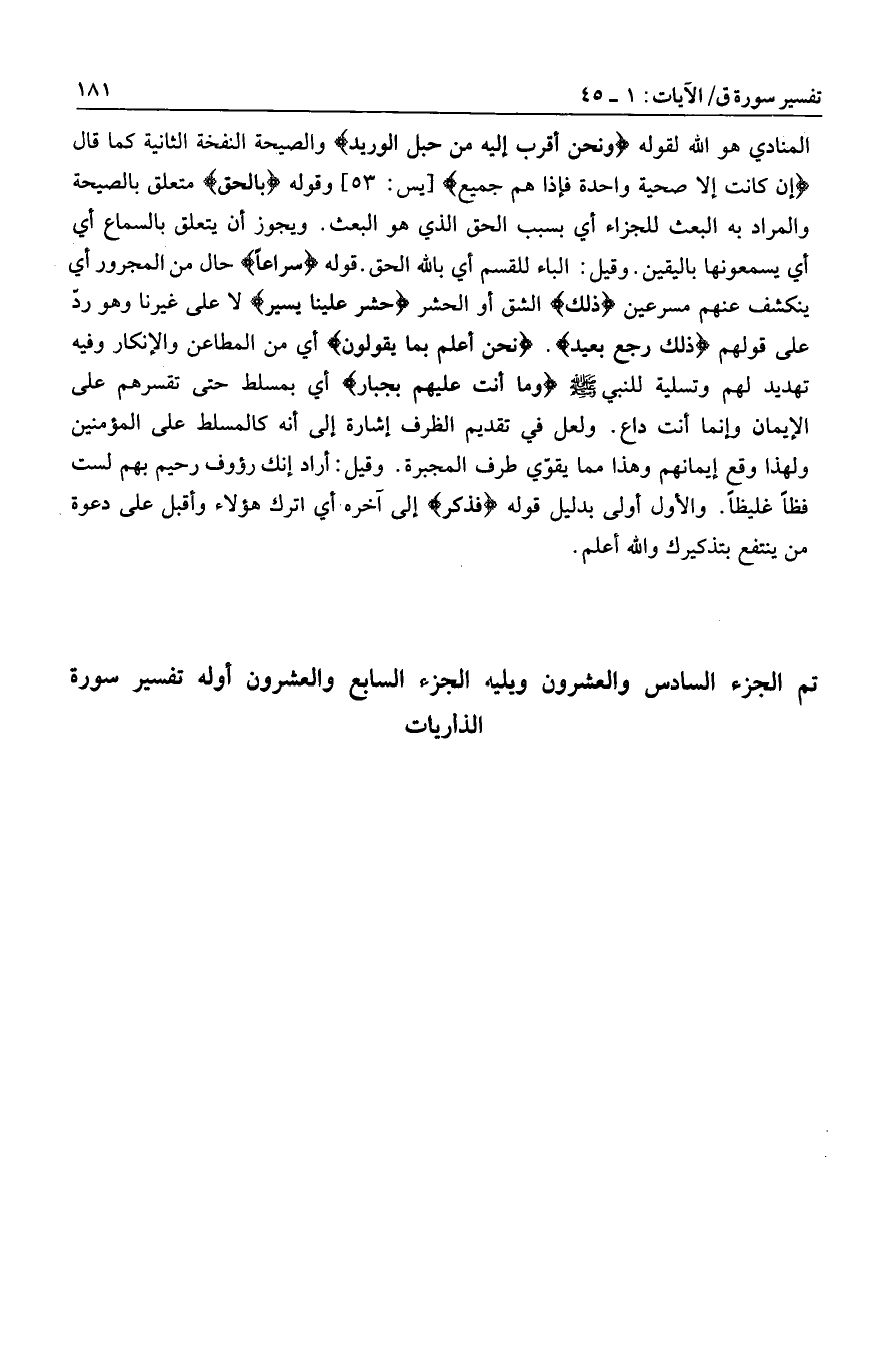 تم الجزء السادس والعشرون ويليه الجزء السابع والعشرون أوله تفسير سورة الذاريات