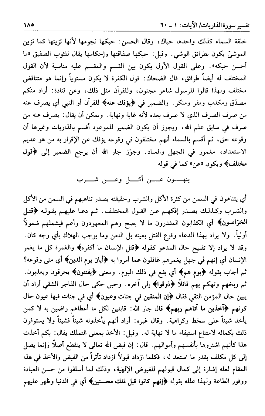 خلقة السماء كذلك واحدها حباك، وقال الحسن: حبكها نجومها لأنها تزينها كما تزين الموشىّ يكون بطرائق الوشي. وقيل: حبكها صفاقتها وإحكامها يقال للثوب الصفيق «ما أحسن حبكه» . وعلى القول الأول يكون بين القسم والمقسم عليه مناسبة لأن القول المختلف له أيضا طرائق، قال الضحاك: قول الكفرة لا يكون مستويا وإنما هو متناقض مختلف ولهذا قالوا للرسول شاعر مجنون، وللقرآن مثل ذلك، وعن قتادة: أراد منكم مصدّق ومكذب ومقر ومنكر. والضمير في يُؤْفَكُ عَنْهُ للقرآن أو النبي أي يصرف عنه من صرف الصرف الذي لا صرف بعده لأنه غاية ونهاية. ويمكن أن يقال: يصرف عنه من صرف في سابق علم الله، ويجوز أن يكون الضمير للموعود أقسم بالذاريات وغيرها أن وقوعه حق، ثم أقسم بالسماء أنهم مختلفون في وقوعه يؤفك عن الإقرار به من هو عديم الاستعداد، مغمور في الجهل والعناد. وجوّز جار الله أن يرجع الضمير إلى قَوْلٍ مُخْتَلِفٍ ويكون «عن» كما في قوله ينهون عن أكل وعن شرب أي يتناهون في السمن من كثرة الأكل والشرب وحقيقته يصدر تناهيهم في السمن من الأكل والشرب وكذلك يصدر إفكهم عن القول المختلف. ثم دعا عليهم بقوله قُتِلَ الْخَرَّاصُونَ أي الكذابون المقدرون ما لا يصح وهم المعهودون وأعم فيشملهم شمولا أوليا. ولا يراد بهذا الدعاء وقوع القتل بعينه بل اللعن وما يوجب الهلاك بأي وجه كان.