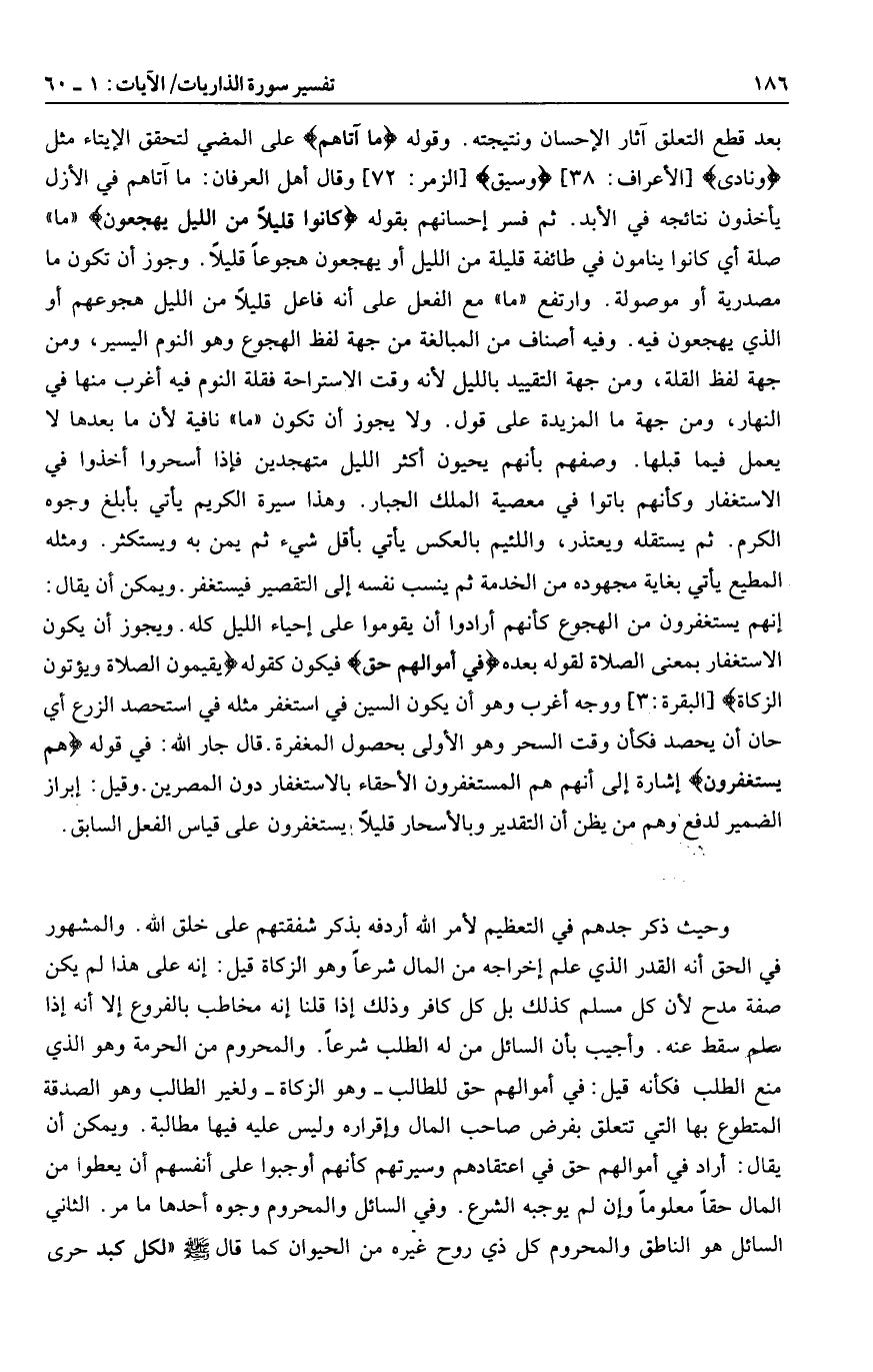 بعد قطع التعلق آثار الإحسان ونتيجته. وقوله ما آتاهُمْ على المضي لتحقق الإيتاء مثل وَنادى [الأعراف: 38] وَسِيقَ [الزمر: 72] وقال أهل العرفان: ما آتاهم في الأزل يأخذون نتائجه في الأبد. ثم فسر إحسانهم بقوله كانُوا قَلِيلًا مِنَ اللَّيْلِ ما يَهْجَعُونَ «ما» صلة أي كانوا ينامون في طائفة قليلة من الليل أو يهجعون هجوعا قليلا. وجوز أن تكون ما مصدرية أو موصولة. وارتفع «ما» مع الفعل على أنه فاعل قليلا من الليل هجوعهم أو الذي يهجعون فيه. وفيه أصناف من المبالغة من جهة لفظ الهجوع وهو النوم اليسير، ومن جهة لفظ القلة، ومن جهة التقييد بالليل لأنه وقت الاستراحة فقلة النوم فيه أغرب منها في النهار، ومن جهة ما المزيدة على قول. ولا يجوز أن تكون «ما» نافية لأن ما بعدها لا يعمل فيما قبلها. وصفهم بأنهم يحيون أكثر الليل متهجدين فإذا أسحروا أخذوا في الاستغفار وكأنهم باتوا في معصية الملك الجبار. وهذا سيرة الكريم يأتي بأبلغ وجوه الكرم. ثم يستقله ويعتذر، واللئيم بالعكس يأتي بأقل شيء ثم يمن به ويستكثر. ومثله المطيع يأتي بغاية مجهوده من الخدمة ثم ينسب نفسه إلى التقصير فيستغفر. ويمكن أن يقال: