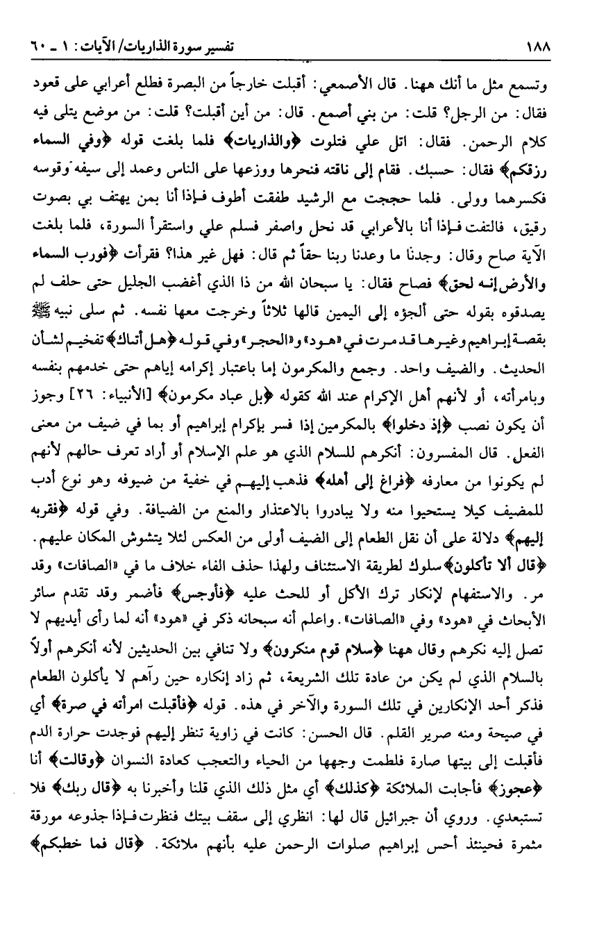 وتسمع مثل ما أنك هاهنا. قال الأصمعي: أقبلت خارجا من البصرة فطلع أعرابي على قعود فقال: من الرجل؟ قلت: من بني أصمع. قال: من أين أقبلت؟ قلت: من موضع يتلى فيه كلام الرحمن. فقال: اتل علي فتلوت وَالذَّارِياتِ فلما بلغت قوله وَفِي السَّماءِ رِزْقُكُمْ فقال: حسبك. فقام إلى ناقته فنحرها ووزعها على الناس وعمد إلى سيفه وقوسه فكسرهما وولى. فلما حججت مع الرشيد طفقت أطوف فإذا أنا بمن يهتف بي بصوت رقيق، فالتفت فإذا أنا بالأعرابي قد نحل واصفر فسلم علي واستقرأ السورة، فلما بلغت الآية صاح وقال: وجدنا ما وعدنا ربنا حقا ثم قال: فهل غير هذا؟ فقرأت فَوَ رَبِّ السَّماءِ وَالْأَرْضِ إِنَّهُ لَحَقٌّ فصاح فقال: يا سبحان الله من ذا الذي أغضب الجليل حتى حلف لم يصدقوه بقوله حتى ألجئوه إلى اليمين قالها ثلاثا وخرجت معها نفسه. ثم سلى نبيه صلى الله عليه وسلم بقصة إبراهيم وغيرها قد مرت في «هود» و «الحجر» وفي قوله هَلْ أَتاكَ تفخيم لشأن الحديث. والضيف واحد. وجمع والمكرمون إما باعتبار إكرامه إياهم حتى خدمهم بنفسه وبامرأته، أو لأنهم أهل الإكرام عند الله كقوله بَلْ عِبادٌ مُكْرَمُونَ [الأنبياء: 26] وجوز أن يكون نصب إِذْ دَخَلُوا بالمكرمين إذا فسر بإكرام إبراهيم أو بما في ضيف من معنى الفعل. قال المفسرون: أنكرهم للسلام الذي هو علم الإسلام أو أراد تعرف حالهم لأنهم لم يكونوا من معارفه فَراغَ إِلى أَهْلِهِ فذهب إليهم في خفية من ضيوفه وهو نوع أدب للمضيف كيلا يستحيوا منه ولا يبادروا بالاعتذار والمنع من الضيافة. وفي قوله فَقَرَّبَهُ إِلَيْهِمْ دلالة على أن نقل الطعام إلى الضيف أولى من العكس لئلا يتشوش المكان عليهم.