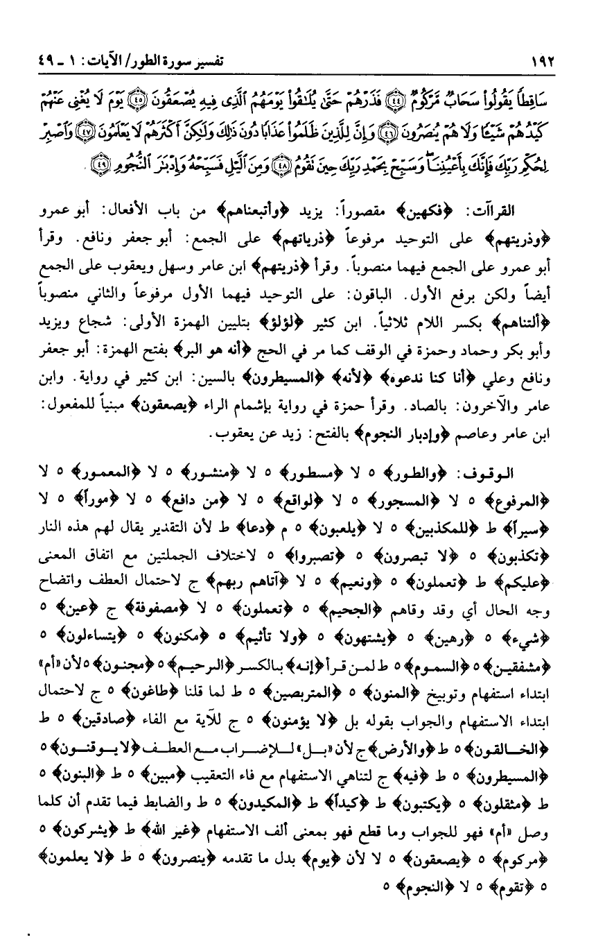 وَالطُّورِ هـ لا مَسْطُورٍ هـ لا مَنْشُورٍ هـ لا الْمَعْمُورِ هـ لا الْمَرْفُوعِ هـ لا الْمَسْجُورِ هـ لا لَواقِعٌ هـ لا مِنْ دافِعٍ هـ لا مَوْراً هـ لا سَيْراً ط لِلْمُكَذِّبِينَ هـ لا يَلْعَبُونَ هـ م دَعًّا ط لأن التقدير يقال لهم هذه النار تُكَذِّبُونَ هـ لا تُبْصِرُونَ هـ تَصْبِرُوا هـ لاختلاف الجملتين مع اتفاق المعنى عَلَيْكُمْ ط تَعْمَلُونَ هـ وَنَعِيمٍ هـ لا آتاهُمْ رَبُّهُمْ ج لاحتمال العطف واتضاح وجه الحال أي وقد وقاهم الْجَحِيمِ هـ تَعْمَلُونَ هـ لا مَصْفُوفَةٍ ج عِينٍ هـ شَيْءٍ هـ رَهِينٌ هـ يَشْتَهُونَ هـ وَلا تَأْثِيمٌ هـ مَكْنُونٌ هـ يَتَساءَلُونَ هـ مُشْفِقِينَ هـ السَّمُومِ هـ ط لمن قرأ إِنَّهُ بالكسر الرَّحِيمُ هـ مَجْنُونٍ هـ لأن «أم» ابتداء استفهام وتوبيخ الْمَنُونِ هـ الْمُتَرَبِّصِينَ هـ ط لما قلنا طاغُونَ هـ ج لاحتمال ابتداء الاستفهام والجواب بقوله بل لا يُؤْمِنُونَ هـ ج للآية مع الفاء صادِقِينَ هـ ط الْخالِقُونَ هـ ط وَالْأَرْضَ ج لأن «بل» للإضراب مع العطف لا يُوقِنُونَ هـ المسيطرون هـ ط فِيهِ ج لتناهي الاستفهام مع فاء التعقيب مُبِينٍ هـ ط الْبَنُونَ هـ ط مُثْقَلُونَ هـ يَكْتُبُونَ ط كَيْداً ط الْمَكِيدُونَ هـ ط والضابط فيما تقدم أن كلما وصل «أم» فهو للجواب وما قطع فهو بمعنى ألف الاستفهام غَيْرُ اللَّهِ ط يُشْرِكُونَ هـ مَرْكُومٌ هـ يُصْعَقُونَ هـ لا لأن يَوْمَ بدل ما تقدمه يُنْصَرُونَ هـ ط لا يَعْلَمُونَ هـ تَقُومُ هـ لا النُّجُومِ هـ