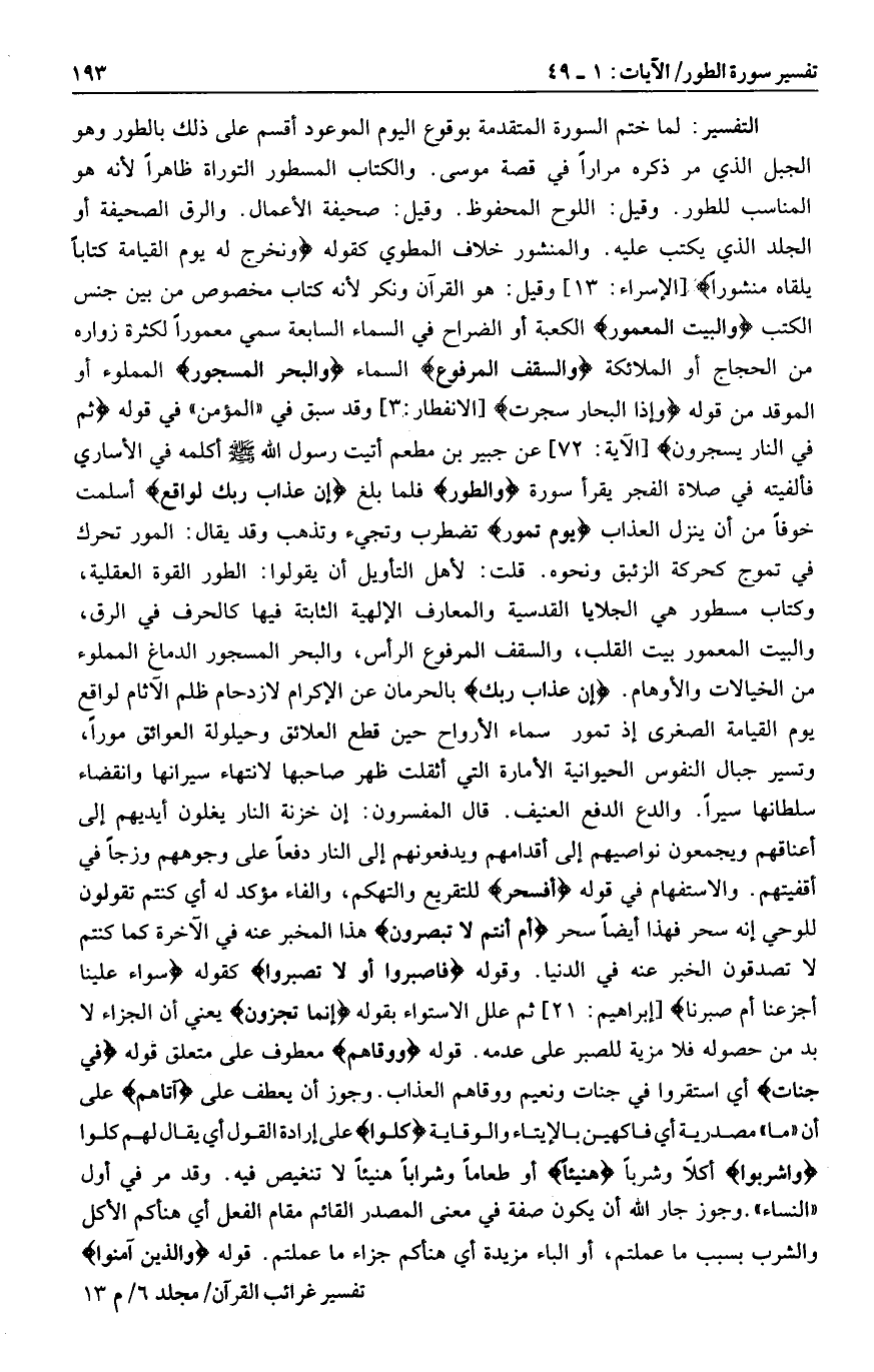 يَوْمَ تَمُورُ تضطرب وتجيء وتذهب وقد يقال: المور تحرك في تموج كحركة الزئبق ونحوه. قلت: لأهل التأويل أن يقولوا: الطور القوة العقلية، وكتاب مسطور هي الجلايا القدسية والمعارف الإلهية الثابتة فيها كالحرف في الرق، والبيت المعمور بيت القلب، والسقف المرفوع الرأس، والبحر المسجور الدماغ المملوء من الخيالات والأوهام. إِنَّ عَذابَ رَبِّكَ بالحرمان عن الإكرام لازدحام ظلم الآثام لواقع يوم القيامة الصغرى إذ تمور سماء الأرواح حين قطع العلائق وحيلولة العوائق مورا، وتسير جبال النفوس الحيوانية الأمارة التي أثقلت ظهر صاحبها لانتهاء سيرانها وانقضاء سلطانها سيرا. والدع الدفع العنيف. قال المفسرون: إن خزنة النار يغلون أيديهم إلى أعناقهم ويجمعون نواصيهم إلى أقدامهم ويدفعونهم إلى النار دفعا على وجوههم وزجا في أقفيتهم. والاستفهام في قوله أَفَسِحْرٌ للتقريع والتهكم، والفاء مؤكد له أي كنتم تقولون للوحي إنه سحر فهذا أيضا سحر أَمْ أَنْتُمْ لا تُبْصِرُونَ هذا المخبر عنه في الآخرة كما كنتم لا تصدقون الخبر عنه في الدنيا. وقوله فَاصْبِرُوا أَوْ لا تَصْبِرُوا كقوله سَواءٌ عَلَيْنا أَجَزِعْنا أَمْ صَبَرْنا [إبراهيم: 21] ثم علل الاستواء بقوله إِنَّما تُجْزَوْنَ يعني أن الجزاء لا بد من حصوله فلا مزية للصبر على عدمه. قوله وَوَقاهُمْ معطوف على متعلق قوله فِي جَنَّاتٍ أي استقروا في جنات ونعيم ووقاهم العذاب. وجوز أن يعطف على آتاهُمْ على أن «ما» مصدرية أي فاكهين بالإيتاء والوقاية كُلُوا على إرادة القول أي يقال لهم كلوا وَاشْرَبُوا أكلا وشربا هَنِيئاً أو طعاما وشرابا هنيئا لا تنغيص فيه. وقد مر في أول «النساء» . وجوز جار الله أن يكون صفة في معنى المصدر القائم مقام الفعل أي هنأكم الأكل والشرب بسبب ما عملتم، أو الباء مزيدة أي هنأكم جزاء ما عملتم. قوله وَالَّذِينَ آمَنُوا
