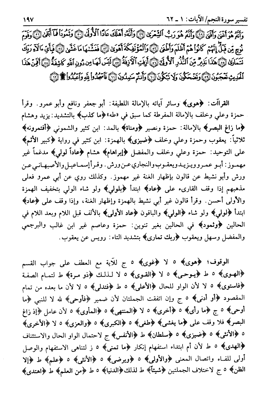 هَوى وسائر آياته بالإمالة اللطيفة: أبو جعفر ونافع وأبو عمرو. وقرأ حمزة وعلي وخلف بالإمالة المفرطة كما سبق في «طه» ما كذب بالتشديد: يزيد وهشام ما زاغَ الْبَصَرُ بالإمالة: حمزة ونصير وَمَناةَ بالمد: ابن كثير والشموني أفتمرونه ثلاثيا: يعقوب وحمزة وعلي وخلف ضِيزى بالهمزة: ابن كثير في رواية كبير الإثم على التوحيد: حمزة وعلي وخلف والمفضل إبراهام هشام عادا لولي مدغما غير مهموز: أبو عمرو ويزيد ويعقوب والنجاري عن ورش. وقرأ إسماعيل والأصبهاني عن ورش وأبو نشيط عن قالون بإظهار الغنة غير مهموز. وكذلك روي عن أبي عمرو فعلى مذهبهم إذا وقف القارئ على عاد ابتدأ ب لولي ولو شاء الولي بتخفيف الهمزة والأولى أحسن. وقرأ قالون غير أبي نشيط بالهمزة وإظهار الغنة، وإذا وقف على عاد ابتدأ لولي ولو شاء الولي والباقون عاد الأولى بالألف قبل اللام وبعد اللام في الحالين وثمود في الحالين بغير تنوين: حمزة وعاصم غير ابن غالب والبرجمي والمفضل وسهل ويعقوب ربك تمارى بتشديد التاء: رويس عن يعقوب.