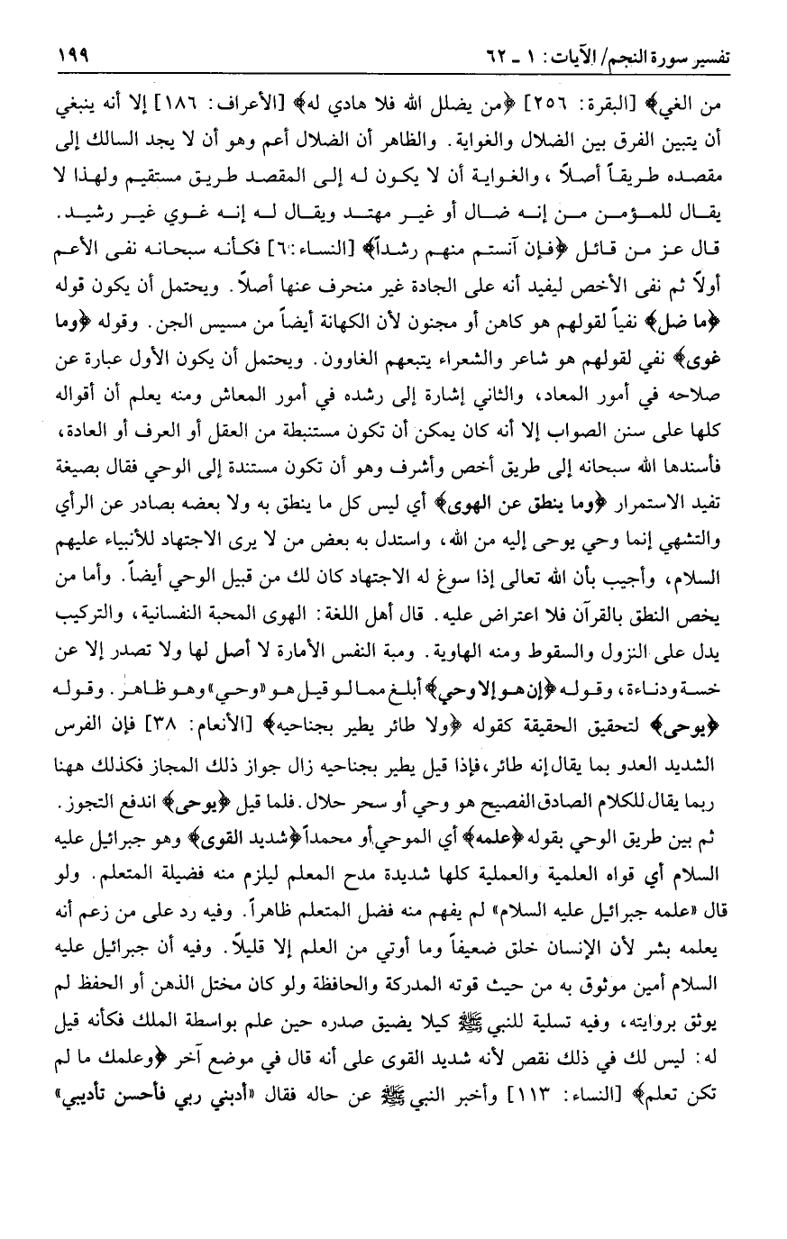 قال عز من قائل فَإِنْ آنَسْتُمْ مِنْهُمْ رُشْداً [النساء: 6] فكأنه سبحانه نفى الأعم أولا ثم نفى الأخص ليفيد أنه على الجادة غير منحرف عنها أصلا. ويحتمل أن يكون قوله ما ضَلَّ نفيا لقولهم هو كاهن أو مجنون لأن الكهانة أيضا من مسيس الجن. وقوله وَما غَوى نفي لقولهم هو شاعر والشعراء يتبعهم الغاوون. ويحتمل أن يكون الأول عبارة عن صلاحه في أمور المعاد، والثاني إشارة إلى رشده في أمور المعاش ومنه يعلم أن أقواله كلها على سنن الصواب إلا أنه كان يمكن أن تكون مستنبطة من العقل أو العرف أو العادة، فأسندها الله سبحانه إلى طريق أخص وأشرف وهو أن تكون مستندة إلى الوحي فقال بصيغة تفيد الاستمرار وَما يَنْطِقُ عَنِ الْهَوى أي ليس كل ما ينطق به ولا بعضه بصادر عن الرأي والتشهي إنما وحي يوحى إليه من الله، واستدل به بعض من لا يرى الاجتهاد للأنبياء عليهم السلام، وأجيب بأن الله تعالى إذا سوغ له الاجتهاد كان لك من قبيل الوحي أيضا. وأما من يخص النطق بالقرآن فلا اعتراض عليه. قال أهل اللغة: الهوى المحبة النفسانية، والتركيب يدل على النزول والسقوط ومنه الهاوية. ومبة النفس الأمارة لا أصل لها ولا تصدر إلا عن خسة ودناءة، وقوله إِنْ هُوَ إِلَّا وَحْيٌ أبلغ مما لو قيل هو «وحي» وهو ظاهر. وقوله يُوحى لتحقيق الحقيقة كقوله وَلا طائِرٍ يَطِيرُ بِجَناحَيْهِ [الأنعام: 38] فإن الفرس الشديد العدو بما يقال إنه طائر، فإذا قيل يطير بجناحيه زال جواز ذلك المجاز فكذلك هاهنا ربما يقال للكلام الصادق الفصيح هو وحي أو سحر حلال. فلما قيل يُوحى اندفع التجوز.