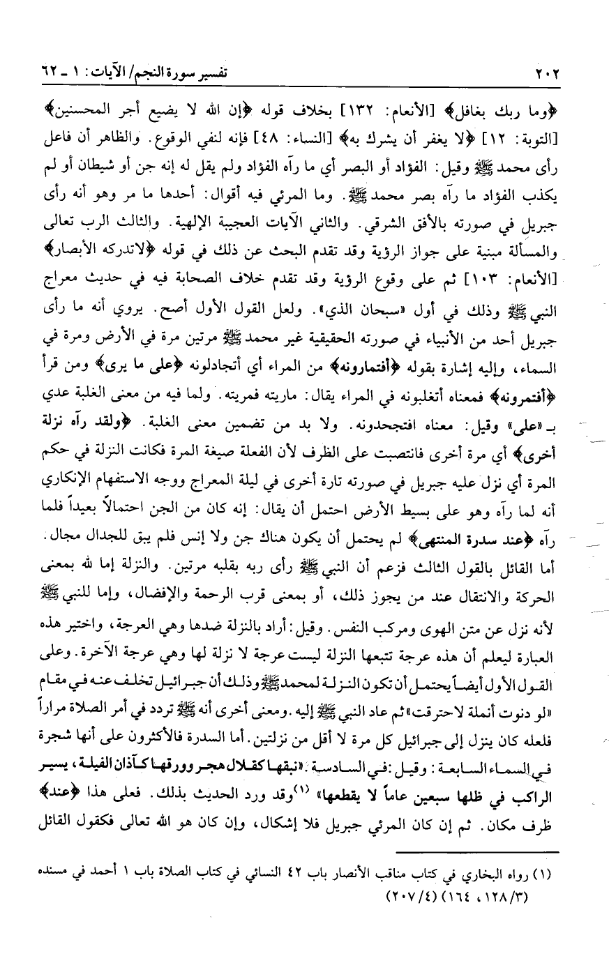 أما القائل بالقول الثالث فزعم أن النبي صلى الله عليه وسلم رأى ربه بقلبه مرتين. والنزلة إما لله بمعنى الحركة والانتقال عند من يجوز ذلك، أو بمعنى قرب الرحمة والإفضال، وإما للنبي صلى الله عليه وسلم لأنه نزل عن متن الهوى ومركب النفس. وقيل: أراد بالنزلة ضدها وهي العرجة، واختير هذه العبارة ليعلم أن هذه عرجة تتبعها النزلة ليست عرجة لا نزلة لها وهي عرجة الآخرة. وعلى القول الأول أيضا يحتمل أن تكون النزلة لمحمد صلى الله عليه وسلم وذلك أن جبرائيل تخلف عنه في مقام «لو دنوت أنملة لاحترقت» ثم عاد النبي صلى الله عليه وسلم إليه. ومعنى أخرى أنه صلى الله عليه وسلم تردد في أمر الصلاة مرارا فلعله كان ينزل إلى جبرائيل كل مرة لا أقل من نزلتين. أما السدرة فالأكثرون على أنها شجرة في السماء السابعة: وقيل: في السادسة.