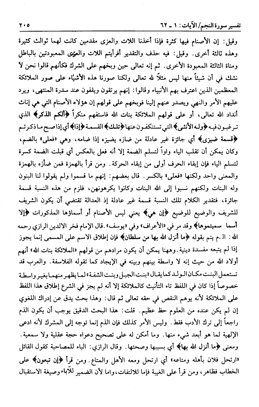 وقيل: إن الأصنام فيها كثرة فإذا أخذنا اللات والعزى مقدمين كانت لهما ثوالث كثيرة وهذه ثالثة أخرى. وقيل: فيه حذف والتقدير أفرأيتم اللات والعزى المعبودتين بالباطل ومناة الثالثة المعبودة الأخرى. ثم إنه تعالى حين وبخهم على الشرك فكأنهم قالوا نحن لا نشك في أن شيئا منها ليس مثلا لله تعالى ولكنا صورنا هذه الأشياء على صور الملائكة المعظمين الذين اعترف بهم الأنبياء وقالوا: إنهم يرتقون ويقفون عند سدرة المنتهى، ويرد عليهم الأمر والنهي ويصدر عنهم إلينا فوبخهم على قولهم إن هؤلاء الأصنام التي هي إناث أنداد الله تعالى، أو على قولهم الملائكة بنات الله فاستفهم منكرا أَلَكُمُ الذَّكَرُ الذي ترغبون فيه وَلَهُ الْأُنْثى التي تستنكفون عنها تِلْكَ القسمة إِذاً أي إذا صح ما ذكرتم قِسْمَةٌ ضِيزى أي جائزة غير عادلة من ضازه يضيزه إذا ضامه، وهي «فعلى» بالضم، وكان يمكن أن تقلب الياء واوا لتسلم الضمة إلا أنه فعل بالعكس أي قبلت الضمة كسرة لتسلم الياء فإن إبقاء الحرف أولى من إبقاء الحركة. ومن قرأ بالهمزة فمن ضأزه بالهمزة والمعنى واحد ولكنها «فعلى» بالكسر. قال بعضهم: إنهم ما قسموا ولم يقولوا لنا البنون وله البنات ولكنهم نسبوا إلى الله البنات وكانوا يكرهونهن، فلزم من هذه النسبة قسمة جائرة، فتقدير الكلام تلك النسبة قسمة غير عادلة إذ العدالة تقتضي أن يكون الشريف للشريف والوضيع للوضيع إِنْ هِيَ يعني ليس الأصنام أو أسماؤها المذكورات إِلَّا أَسْماءٌ سَمَّيْتُمُوها وقد مر في «الأعراف» وفي «يوسف» . قال الإمام فخر الدين الرازي رحمه الله: اليتم يتم بقوله ما أَنْزَلَ اللَّهُ بِها مِنْ سُلْطانٍ فإن إطلاق الاسم على المسمى إنما يجوز إذا لم يتبعه مفسدة دينية. وهاهنا يمكن أن يكون مرادهم من قولهم «الملائكة بنات الله» أنهم أولاد الله من حيث إنه لا واسطة بينهم وبينه في الإيجاد كما تقوله الفلاسفة. والعرب قد تستعمل البنت مكان الولد كما يقال «بنت الجبل وبنت الشفة» لما يظهر منهما بغير واسطة خصوصا إذا كان في اللفظ تاء التأنيث كالملائكة إلا أنه لم يجز في الشرع إطلاق هذا اللفظ على الملائكة لأنه يوهم النقص في حقه تعالى ثم قال: وهذا بحث يدق عن إدراك اللغوي إن لم يكن عنده من العلوم حظ عظيم. قلت: هذا البحث الدقيق يوجب أن يكون الذم راجعا إلى ترك الأدب فقط. وليس الأمر كذلك فإن الذم إنما توجه إلى المشرك لأنه ادعى الإلهية لما هو أبعد شيء منها. وما أمكن له على تصحيح دعواه حجة عقلية ولا سمعية.