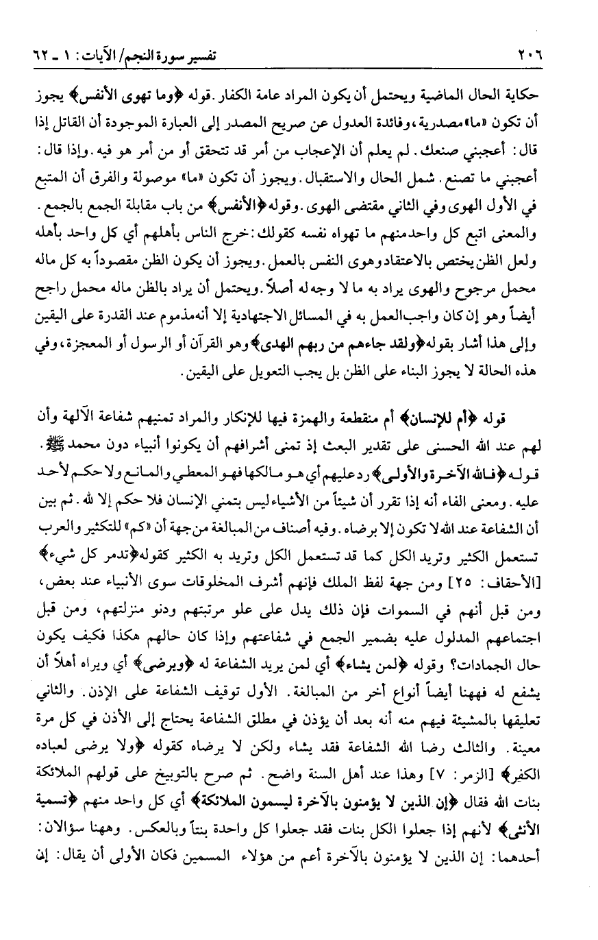 قوله فَلِلَّهِ الْآخِرَةُ وَالْأُولى رد عليهم أي هو مالكها فهو المعطي والمانع ولا حكم لأحد عليه. ومعنى الفاء أنه إذا تقرر أن شيئا من الأشياء ليس بتمني الإنسان فلا حكم إلا لله. ثم بين أن الشفاعة عند الله لا تكون إلا برضاه. وفيه أصناف من المبالغة من جهة أن «كم» للتكثير والعرب تستعمل الكثير وتريد الكل كما قد تستعمل الكل وتريد به الكثير كقوله تُدَمِّرُ كُلَّ شَيْءٍ [الأحقاف: 25] ومن جهة لفظ الملك فإنهم أشرف المخلوقات سوى الأنبياء عند بعض، ومن قبل أنهم في السموات فإن ذلك يدل على علو مرتبتهم ودنو منزلتهم، ومن قبل اجتماعهم المدلول عليه بضمير الجمع في شفاعتهم وإذا كان حالهم هكذا فكيف يكون حال الجمادات؟ وقوله لِمَنْ يَشاءُ أي لمن يريد الشفاعة له وَيَرْضى أي ويراه أهلا أن يشفع له فههنا أيضا أنواع أخر من المبالغة. الأول توقيف الشفاعة على الإذن. والثاني تعليقها بالمشيئة فيهم منه أنه بعد أن يؤذن في مطلق الشفاعة يحتاج إلى الأذن في كل مرة معينة. والثالث رضا الله الشفاعة فقد يشاء ولكن لا يرضاه كقوله وَلا يَرْضى لِعِبادِهِ الْكُفْرَ [الزمر: 7] وهذا عند أهل السنة واضح. ثم صرح بالتوبيخ على قولهم الملائكة بنات الله فقال إِنَّ الَّذِينَ لا يُؤْمِنُونَ بِالْآخِرَةِ لَيُسَمُّونَ الْمَلائِكَةَ أي كل واحد منهم تَسْمِيَةَ الْأُنْثى لأنهم إذا جعلوا الكل بنات فقد جعلوا كل واحدة بنتا وبالعكس. وهاهنا سؤالان: