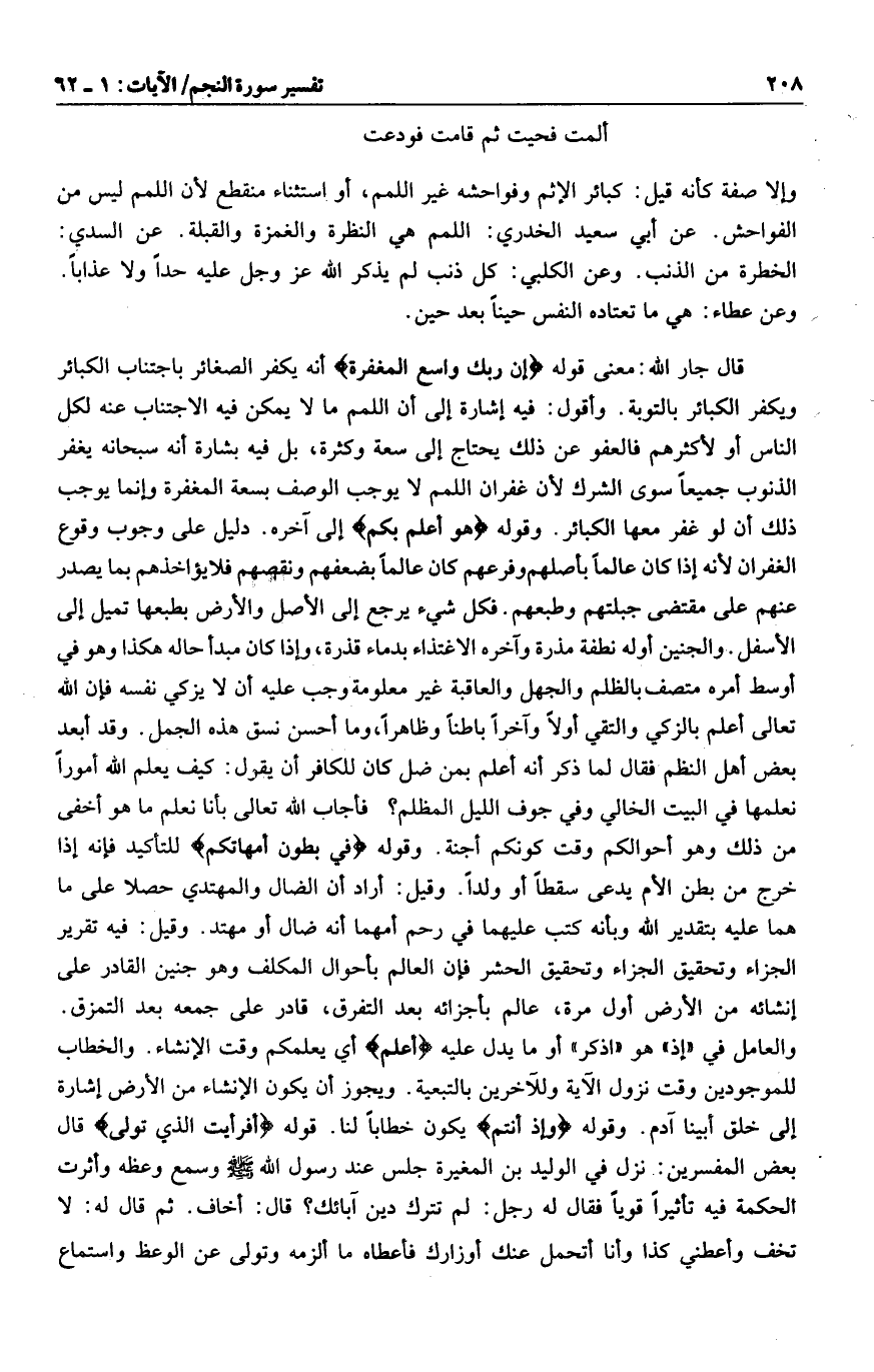 ألمت فحيت ثم قامت فودعت وإلا صفة كأنه قيل: كبائر الإثم وفواحشه غير اللمم، أو استثناء منقطع لأن اللمم ليس من الفواحش. عن أبي سعيد الخدري: اللمم هي النظرة والغمزة والقبلة. عن السدي: